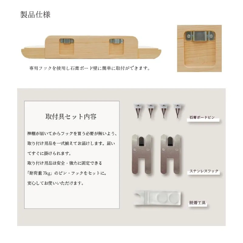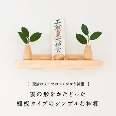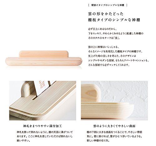 【備考】石膏ボード用釘/専用アダプター付 必ず目上にあるものだから下をスッキリ、やわらかくみせる。 そのフォルムのモチーフは「雲」。 雲の上に神様はいらっしゃる。 そんな幼いころからのイメージをシンプルに具現化します。 棚の柔らかい丸みは、シンプルやモダンな部屋にもマッチしより親近感を持たせてくれます。 純日本製 必ず目上にあるものだから下をスッキリ、やわらかくみせる。そのフォルムのモチーフは「雲」雲の上に神様はいらっしゃる。そんな幼いころからのイメージをシンプルに具現化します。 外寸(高さ×幅×奥行):8×45×15cm 静岡県産 ひのき使用 純日本製 石膏ボード専用釘で壁に簡単設置 取付のために工具をそろえる必要はありません。一式そろえてお届けします。 配送について、商品のサイズや配送先都道府県によって最適な配送業者を選択しております。 業者・配送方法の指定は承れません。ご了承ください。 万が一の不着、紛失、誤配送の場合など、最後まで責任もって対応致しますのでご安心下さい。 宜しくお願い致します。