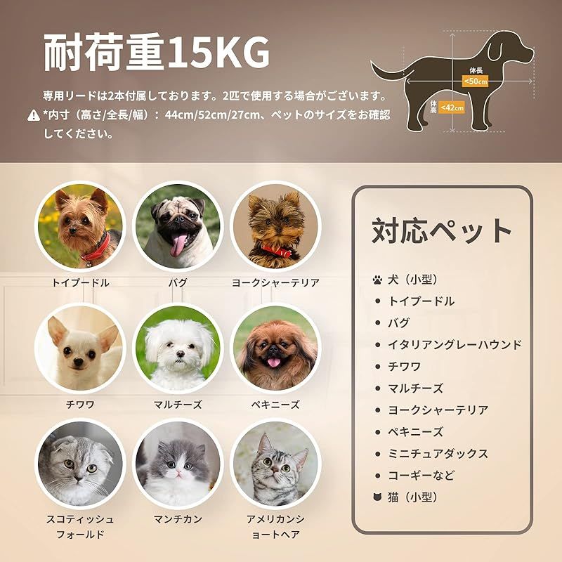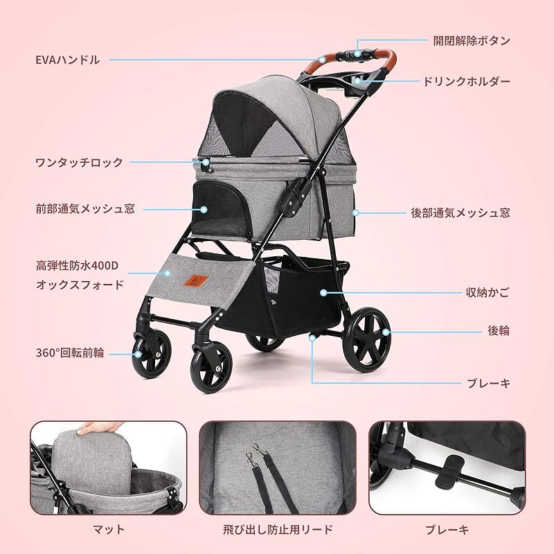 【商品概要】 仕様:愛犬・愛猫のお散歩に便利なペット用カートです。犬バギー展開サイズ(約):長さ46 *幅69 *高さ97(cm)、 収納サイズ(約):長さ23 *幅46 *高さ88(cm)。フレーム:スチール製、生地:400Dオックスフォードポリエステル、車輪:EVA、本体重量(約):4.8KG、耐荷重(約):15KG。 安定性抜群:折り畳みペットカートの車輪は路面からの振動を軽減するように大き目の車輪を採用しており、まだ振動を吸収するに適したEVA耐摩耗性タイヤを使用しておりますので乗車中のペットにやさしいです。ドッグカートの前輪は360°回転することができ、精密ベアリングが付き、車輪がスムーズに動きできます。使いやすい後輪フットブレーキでカートを止める時も安心です。 優れた素材で耐用:犬用カートのメッシュ部分は、爪で引っ掻いても破けにくいしっかりとした素材です、通気性と可視性に優れており虫が中に入りにくい。フレームはスチール製材質を採用して、強度が強くて、耐久性があります。またコットは高品質の高弾性防水400Dオックスフォードファブリックで作られ、耐摩耗性と通気性があり、長時間日光にさらされても色落ちしない。 便利:ワンボタンでボタンを押せば、家にいても外出しても使わないときは簡単に折り畳んで収納できます。軽量設計なので1人でも持ち運びやすい、とても便利です。コンパクトだから、玄関や車のトランクなどの狭い空間にも保管できます。犬用ベビーカーのハンドル部分にはドリンクホルダーと小物入れ付き!下のカゴに荷物も入りできます。マットレスを取り外せて丸洗いできますので、抜け毛やにおいが残りがちなキャリーをいつも清潔に保てます。それにバスケットの左右どちらからでも開閉でき、最大180度開口部が大きく開くので、ペットの乗り降りスムーズに、ケアもやすくなります。 いろんな場所で大活躍:飛び出し防止用リード2本つき、多くのネコちゃん、小型犬、介護用カートとして股関節の問題または不便な動きに適し、旅行しやすい。耐荷重(約)15kgまでのペットにご使用いただけます。コット内寸(高さ/全長/幅):52cm/27cm/44cm、注文する前にサイズをお確認してください。商品は12ヶ月がありますので、何か問題がございましたら、「注文履歴」→「出品者に連絡」から弊店までにご連絡してください。