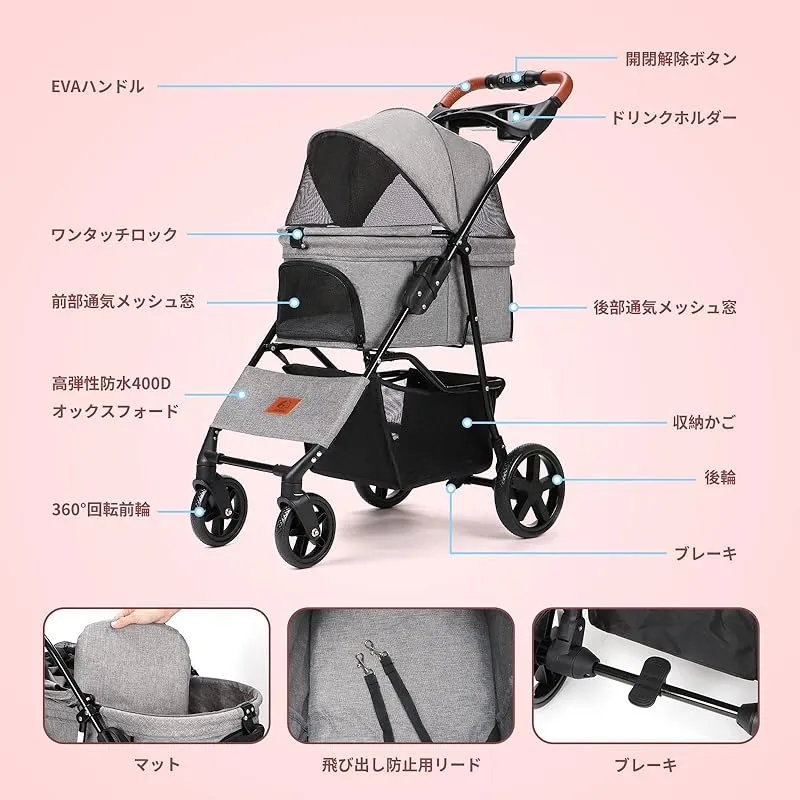 Aikenn ペットカート 犬用ベビーカー 小型犬 折り畳み犬用カート ペットキャリーカート ペットバギーミニ 4輪タイプ 犬介護用カート 猫犬兼用 前輪360°回転 後輪ブレーキ付 飛び出し防止 軽量 ワンタッチ開閉 組み立て簡単 耐荷重15KG 犬用お 0