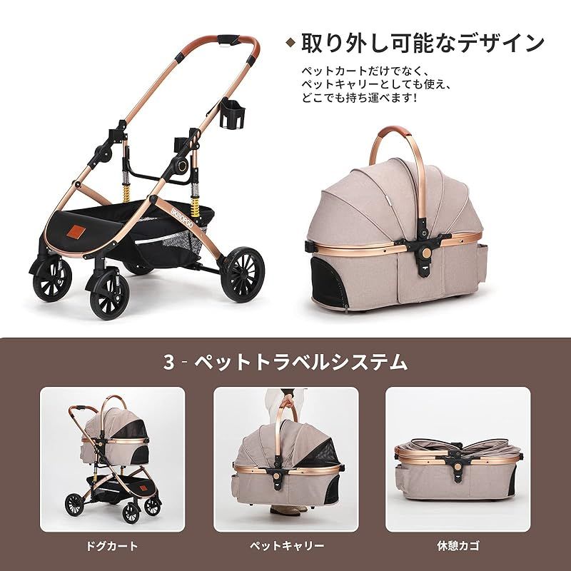 SKISOPGO ペットカート 分離型 犬用ベビーカー いぬ用 バギー 折りたたみ式 ペットバギー 前輪360°回転 後輪ブレーキ付き 組み立てビデオ 耐荷重20Kg 小型犬 中型犬 (カーキ) 0