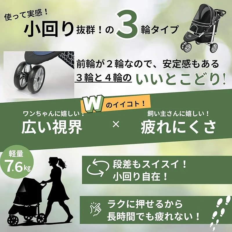 【商品概要】 折りたたみ機能により、片手で簡単にコンパクトに収納できます。 360°回転する前輪で、スムーズな操作が可能です。 後輪にはワンタッチで操作できるストッパー付き。 メッシュ窓カバーで通気性を確保し、ペットが快適に過ごせる設計です。 飛び出し防止リードでペットの安全も考慮されています。 耐荷重:最大約27kgまでのペットに対応。小型犬2~3頭、中型犬1頭が乗れる十分な耐荷重です。