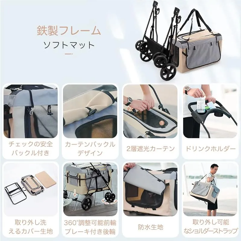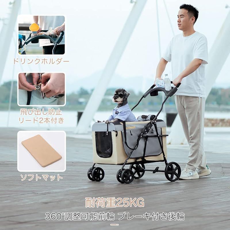 Pandaloli ペットカート 犬 バギー ベビーカー:中型犬 小型犬 猫 多頭 カート 4輪 軽量コンパクト 耐荷重25Kg 前輪360°回転 後輪ブレーキ付き 飛び出し防止リード2本付き 折りたたみ 組み立て簡単 ベージュ色 1