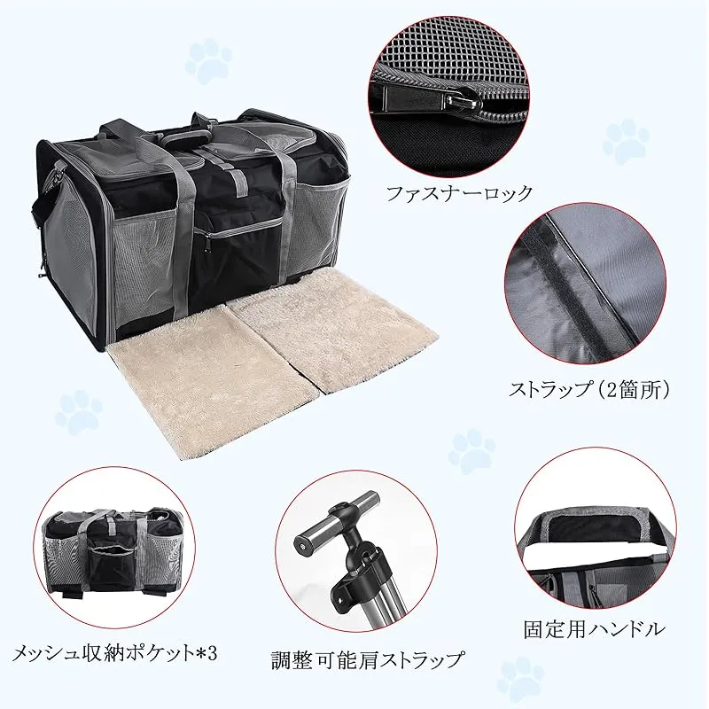 【ご注意事項】重量のみでキャリーを選ばないようお願い申し上げます。猫2匹(10kgまで)や小型犬から中型犬1匹(20kgまで)に最適です。適切なサイズをお選びいただくため、購入前には必ずペットの体長・体高・体重を計測ください。※本製品は航空機座席下への収納ができません。
