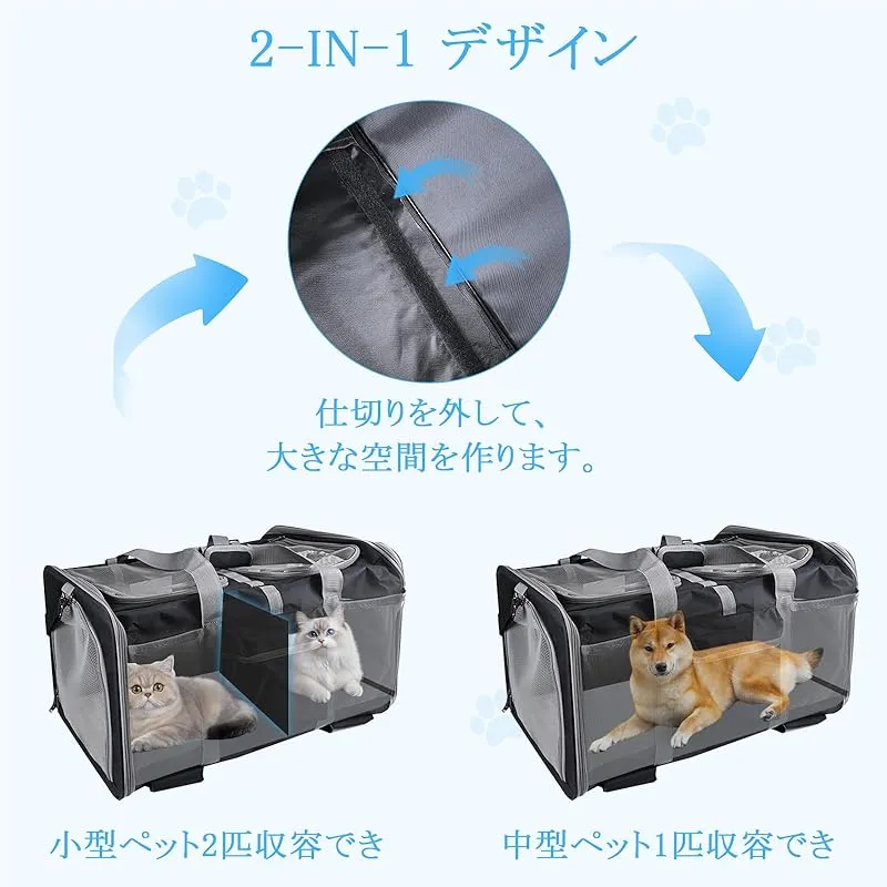 【デュアルコンパートメント設計】2つの小型ペットを収容するための2つの別々のジッパー付きコンパートメントが特徴です。中間にストラップ仕切った後、2匹用として別々に収容できます。ストラップを仕切らないと、中型ペット1匹用の広々空間に早変わります。