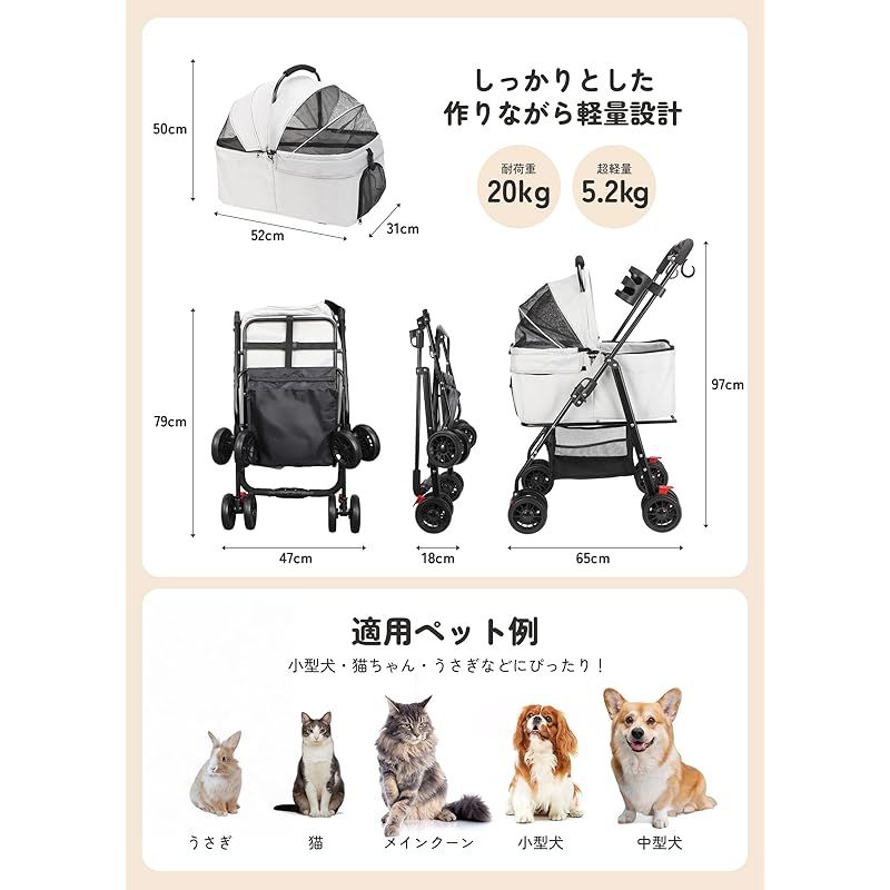 【耐荷重20kg&軽量ボディ(5.2kg)】最大20kgまでの耐荷重を実現したしっかりとしたフレーム構造で、子猫や小型犬の多頭や中型犬1匹の乗車にも対応。ペットキャリーカート重量はわずか5.2kgなので、女性でも片手で楽々持ち運べます。