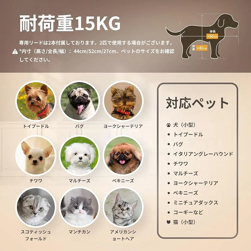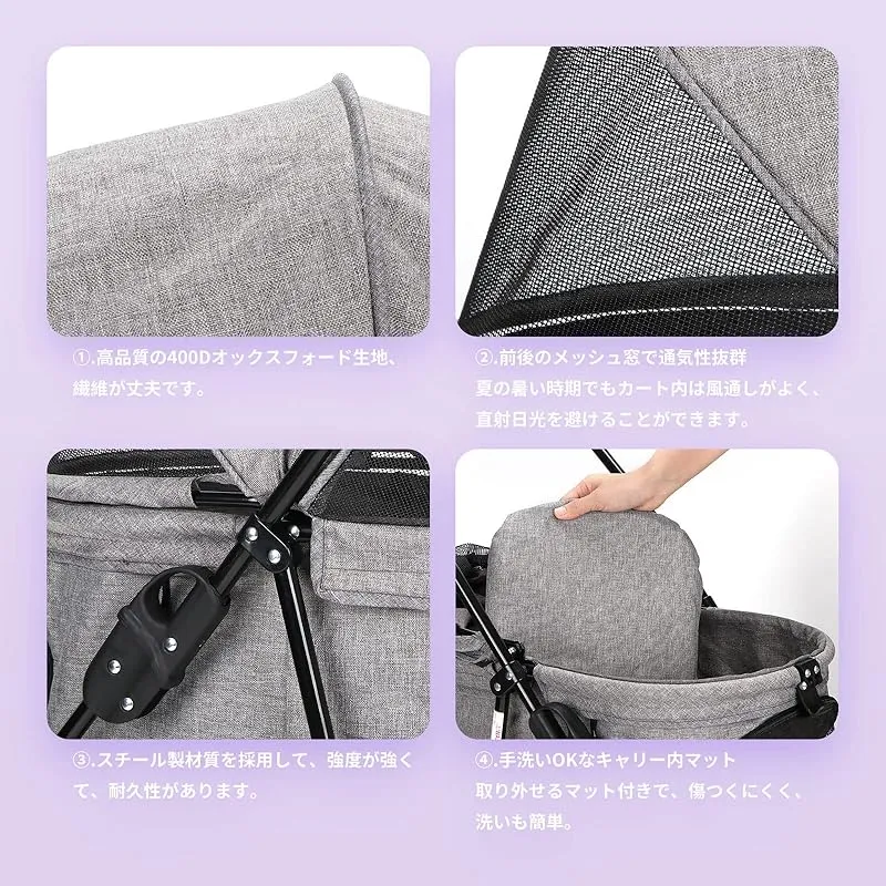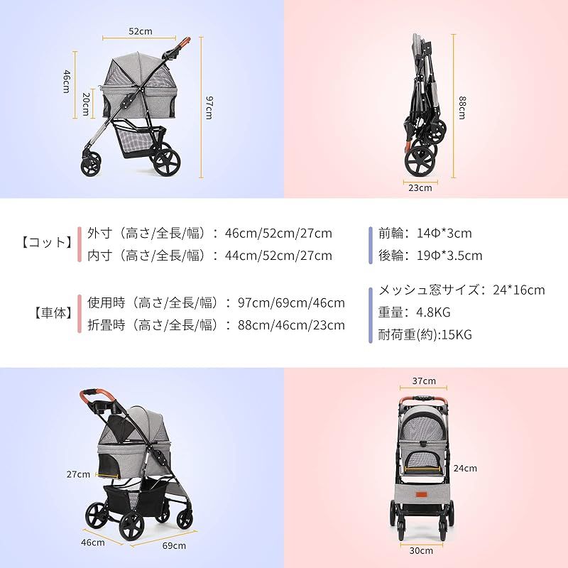 【商品概要】 仕様:愛犬・愛猫のお散歩に便利なペット用カートです。犬バギー展開サイズ(約):長さ46 *幅69 *高さ97(cm)、 収納サイズ(約):長さ23 *幅46 *高さ88(cm)。フレーム:スチール製、生地:400Dオックスフォードポリエステル、車輪:EVA、本体重量(約):4.8KG、耐荷重(約):15KG。 安定性抜群:折り畳みペットカートの車輪は路面からの振動を軽減するように大き目の車輪を採用しており、まだ振動を吸収するに適したEVA耐摩耗性タイヤを使用しておりますので乗車中のペットにやさしいです。ドッグカートの前輪は360°回転することができ、精密ベアリングが付き、車輪がスムーズに動きできます。使いやすい後輪フットブレーキでカートを止める時も安心です。 優れた素材で耐用:犬用カートのメッシュ部分は、爪で引っ掻いても破けにくいしっかりとした素材です、通気性と可視性に優れており虫が中に入りにくい。フレームはスチール製材質を採用して、強度が強くて、耐久性があります。またコットは高品質の高弾性防水400Dオックスフォードファブリックで作られ、耐摩耗性と通気性があり、長時間日光にさらされても色落ちしない。 便利:ワンボタンでボタンを押せば、家にいても外出しても使わないときは簡単に折り畳んで収納できます。軽量設計なので1人でも持ち運びやすい、とても便利です。コンパクトだから、玄関や車のトランクなどの狭い空間にも保管できます。犬用ベビーカーのハンドル部分にはドリンクホルダーと小物入れ付き!下のカゴに荷物も入りできます。マットレスを取り外せて丸洗いできますので、抜け毛やにおいが残りがちなキャリーをいつも清潔に保てます。それにバスケットの左右どちらからでも開閉でき、最大180度開口部が大きく開くので、ペットの乗り降りスムーズに、ケアもやすくなります。 いろんな場所で大活躍:飛び出し防止用リード2本つき、多くのネコちゃん、小型犬、介護用カートとして股関節の問題または不便な動きに適し、旅行しやすい。耐荷重(約)15kgまでのペットにご使用いただけます。コット内寸(高さ/全長/幅):52cm/27cm/44cm、注文する前にサイズをお確認してください。商品は12ヶ月がありますので、何か問題がございましたら、「注文履歴」→「出品者に連絡」から弊店までにご連絡してください。