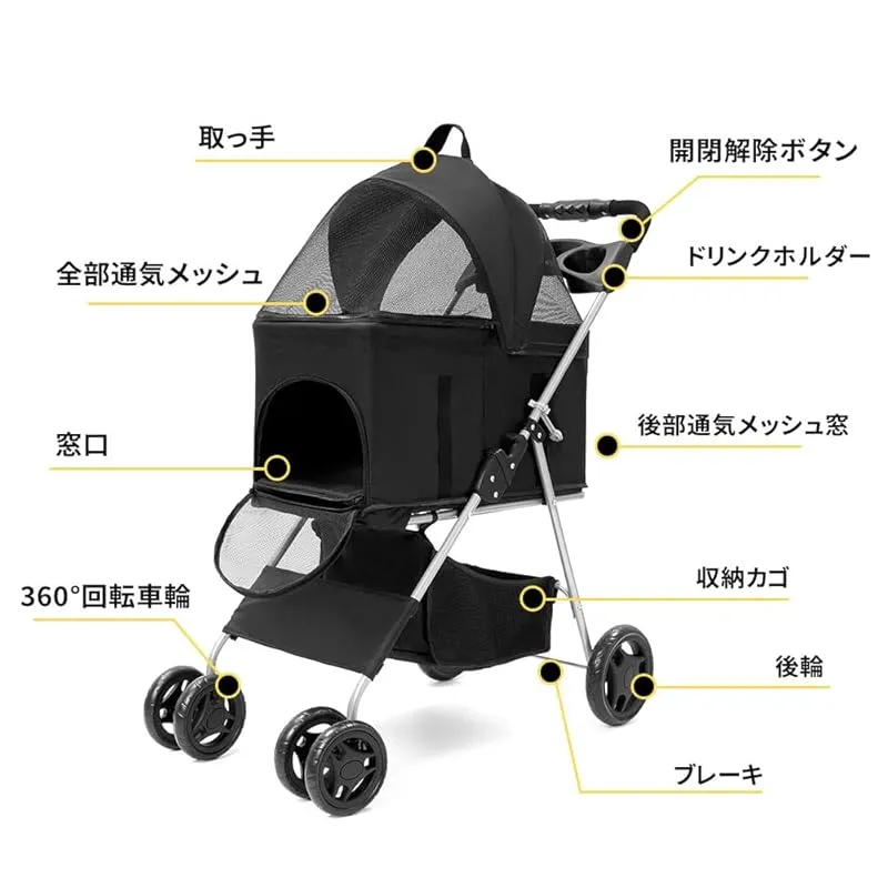 【ワンタッチ収納】ワンタッチで簡単に折りたたみ、場所が取らず、コンパクトに収納できます。旅行中でもとても便利です。犬カートバギーの下部には、大容量の収納バスケットが付き、散歩用グッズやペット用品は収納できます。