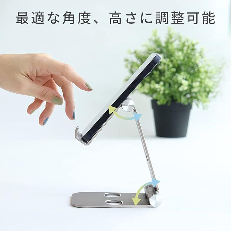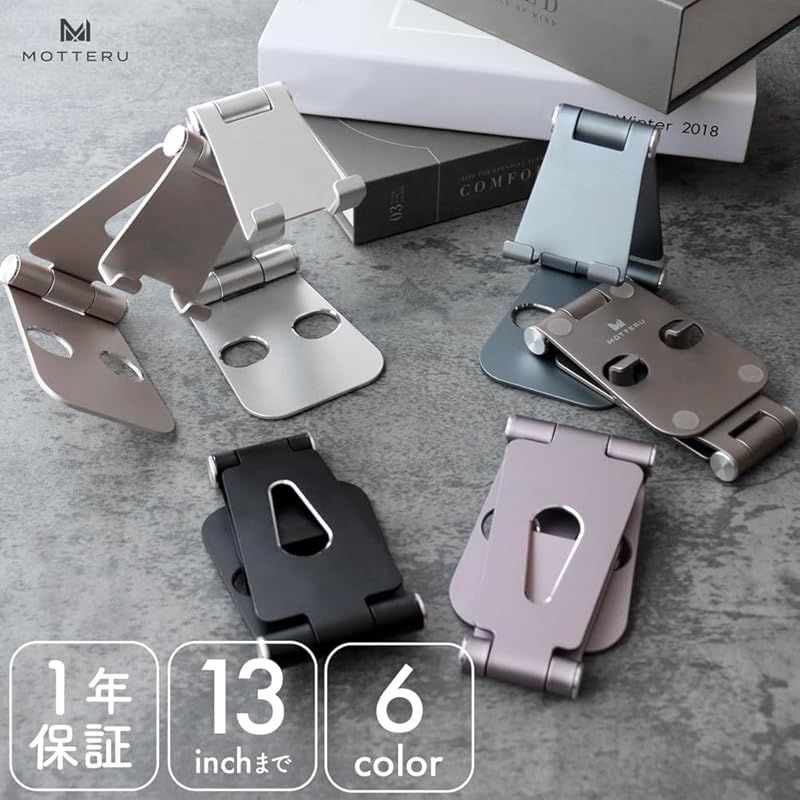 【商品概要】 タブレットにも対応しているアルミスタンド:スマートフォンだけでなくタブレットにも対応しているアルミスタンドです。置いたまま操作したり、通話や動画鑑賞にも便利です。 シンプルなデザインで高級感のあるアルミスタンド:シンプルなデザインはインテリアに調和します。 また、アルミニウム製のスタンドは高級感を演出いたします。※ホワイトのみ縁の塗装(シルバー)がございません。ご了承ください。※ホワイトのみ塗装の仕様がマット仕上げとなり、他色とは異なります。 スタンドに載せたまま充電もイヤホンも使用可能:縦置きにした端末の充電ポートに当たる部分が開いているので、充電ケーブルやイヤホンを挿したままスタンドに載せることができます。 シリコンパッドで端末を固定・保護:スマートフォンやタブレット等の端末と接触する底面および土台部分には、シリコン素材のパッドが付いており、端末とスタンド、スタンドとデスクの設置面にフィットして滑り防止になります。付属のキズ防止用シリコンパッドを使うことで、端末をより固定させることができます。 「株式会社MOTTERU」は日本企業でございます。商品企画・開発・設計・検証・サポートは神奈川県海老名市、生産は中国にて行っております。こちらの製品の期間は1年間となります。TEL:046-200-7090 ※お電話でのお問合せは下記時間にお願いいたします。平日 10:00~12:00/13:00~17:00 MAIL:support@motteru.co.jp ※土日祝祭日・弊社休業日はお休みをいただきます。休業日や時間外のメールの返信や配送は翌営業日以降となります。ご了承ください。