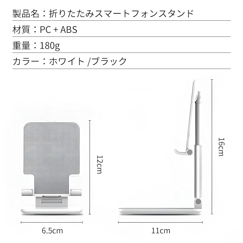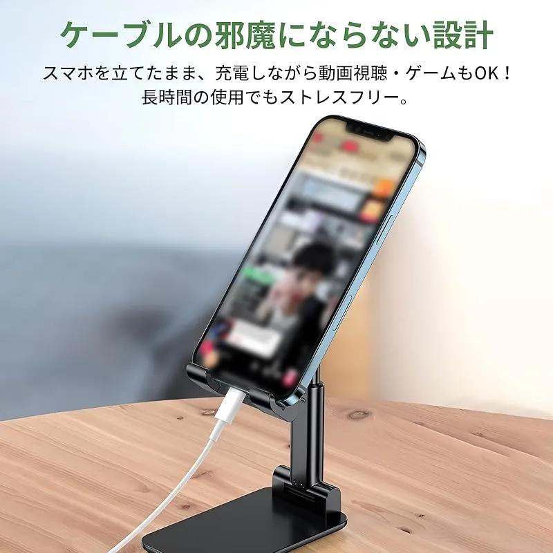 【商品概要】 角度調整機能: スマートフォンの視聴角度を最適な位置に調整可能で、快適な視聴体験を提供します 折りたたみ設計: コンパクトに折りたためる構造で、持ち運びや収納に便利なポータブル設計 安定性重視: 広い台座と滑り止め加工により、デバイスをしっかりと固定し安定した設置を実現 多機種対応: さまざまなサイズのスマートフォンやタブレットに対応する汎用性の高いデザイン 素材・仕上げ: 高品質な黒色プラスチック素材を使用し、表面には滑り止め加工を施しています