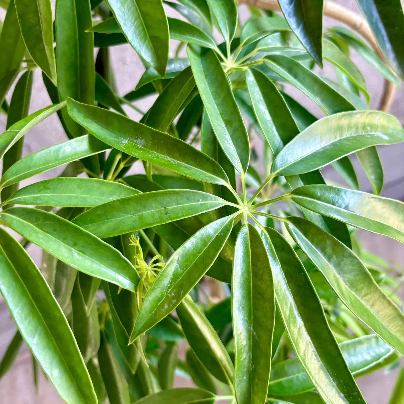 【育て方】 シェフレラ アンガスティフォリアは日当たりと風通しがよい環境を好みます。ただし、真夏の直射日光や西日に当たると、葉焼けする可能性があるので注意が必要です。 耐陰性はありますが、ほとんど日光が入らないような暗すぎる場所ではうまく生育できません。葉がポロポロと落ちたり、徒長したりするため、明るい窓際に置いてください。 水やりの際、春夏の生育期には、手で土を触って水分を感じなくなったら鉢底から水が流れるくらいに、しっかり水やりしてください。 冬は土が乾いてから2~3日後に与えてください。