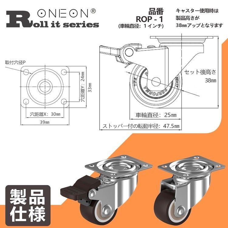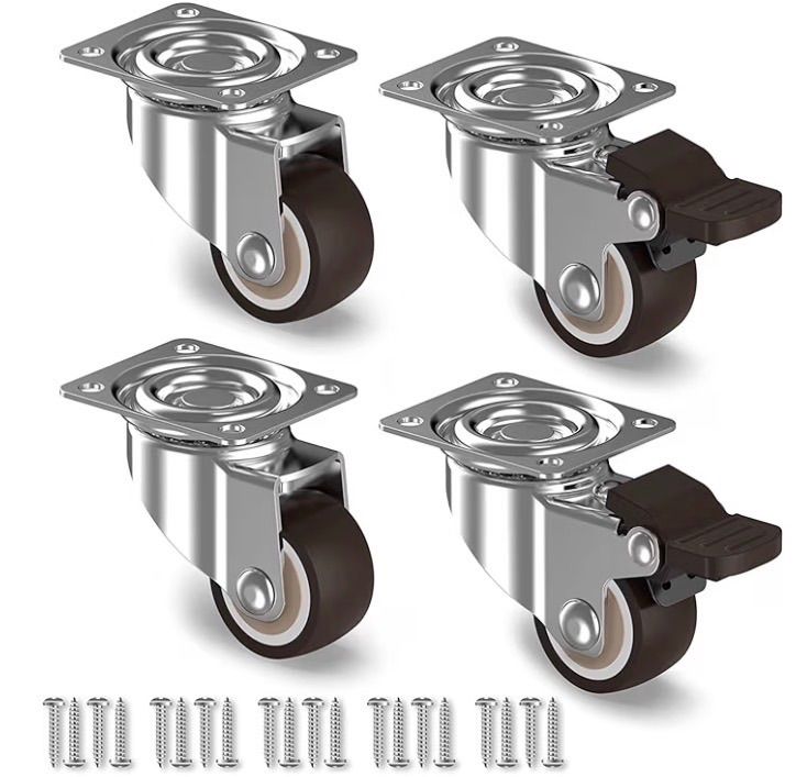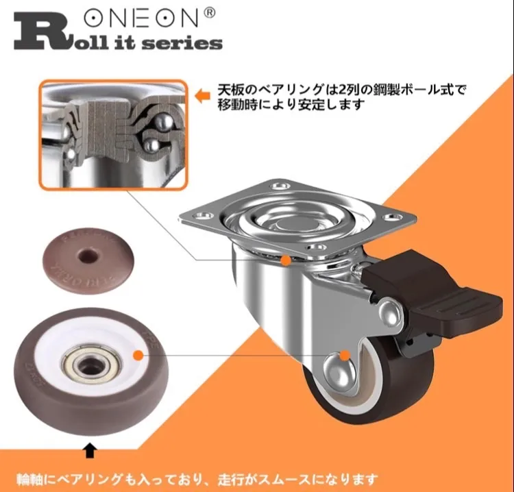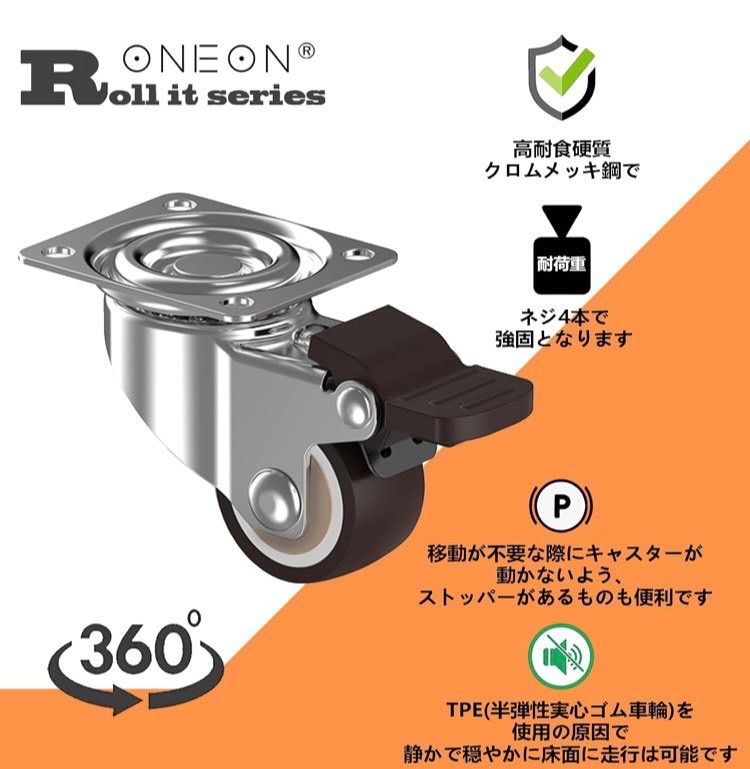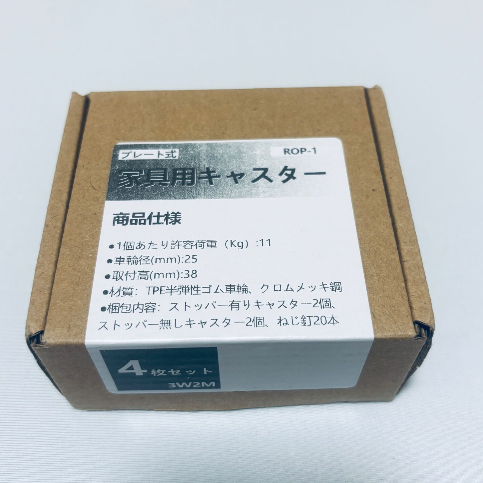 プレート式 キャスター 4個セット ブレーキ付き 360度回転 静音 1インチ TPEゴム輪 自在キャスター ネジ付き ストッパー付き 便利グッズ(ROP-1)