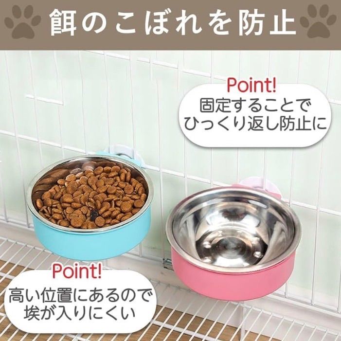 【餌や水のこぼれを防止】ボウルが固定されるためひっくり返すことが無くなり、餌の散らばりや水の濡れを防止できます。容器が地面より高い位置があるためホコリやペットの毛が入ることを防止できます。