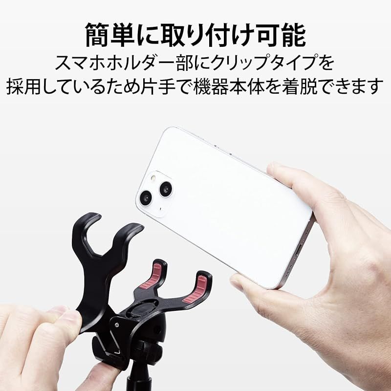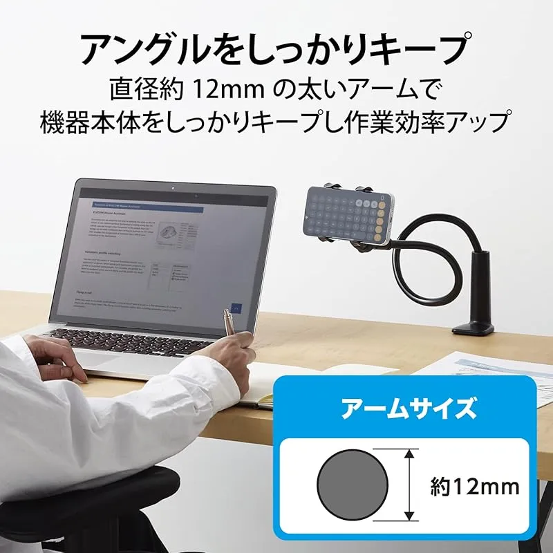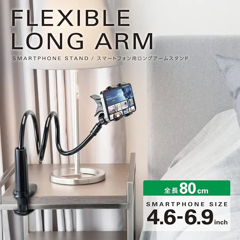 【商品概要】 デスクやベッドルームのサイドテーブル、オフィスのデスクなどお好みの場所にスマートフォンを設置して、自由な高さ・角度で使える全長80cmのロングアームスタンドです。 フレキシブルアームで機器本体をお好みの高さ・角度に調節できます。 直径約12mmの太いアームで、アームのアングルをしっかりキープします。 スマホホルダー部はクリップタイプを採用。片手で機器本体を着脱できます。 ヘッドクリップ内側には、スマートフォンのズレを防ぎキズを予防する保護シートが付いています。 外形寸法 ヘッドクリップ:約W72×D80×H80mm、アーム:約560mm、ベースホルダー:約W54×D76×H130mm(収納時)