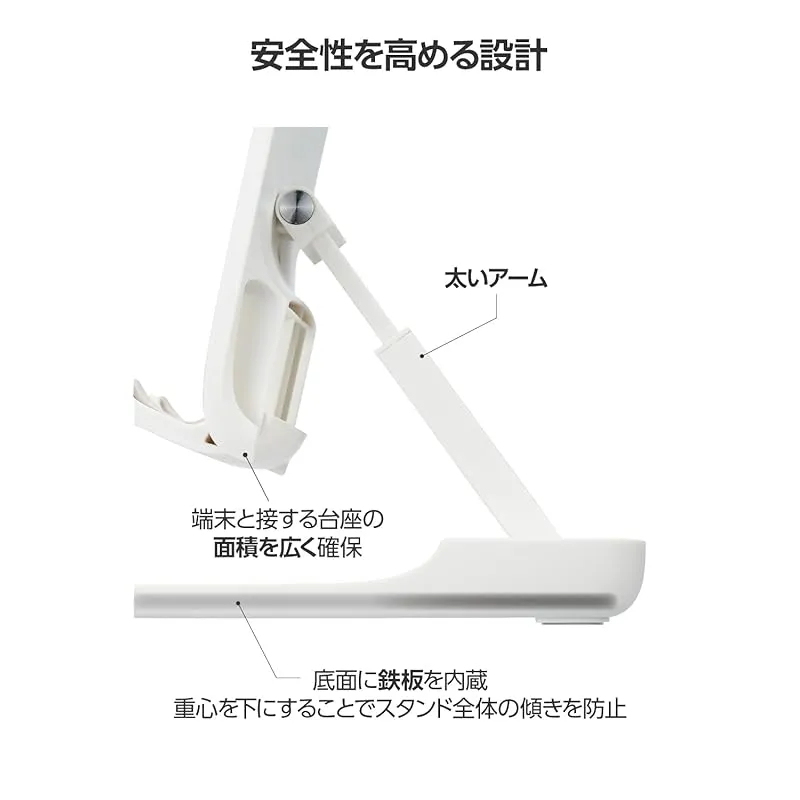 【商品概要】 広い面で端末を支える、高い安定性のスマートフォン・タブレット用スタンドです。 安定性を高めるために、端末と接する台座の面積を広く確保し、アーム部分を太くしています。さらに底面に鉄板を内蔵して重心を下にすることで、スタンド全体の傾きを防止します。 台座とホルダー部の端末設置面、底面にはシリコン製の滑り止めが付いています。 アーム部分はお好みに合わせて、角度と長さを自由に調節できます。 ホルダー部は約1.8cmの幅があり、ケースを付けたままでも設置できます。