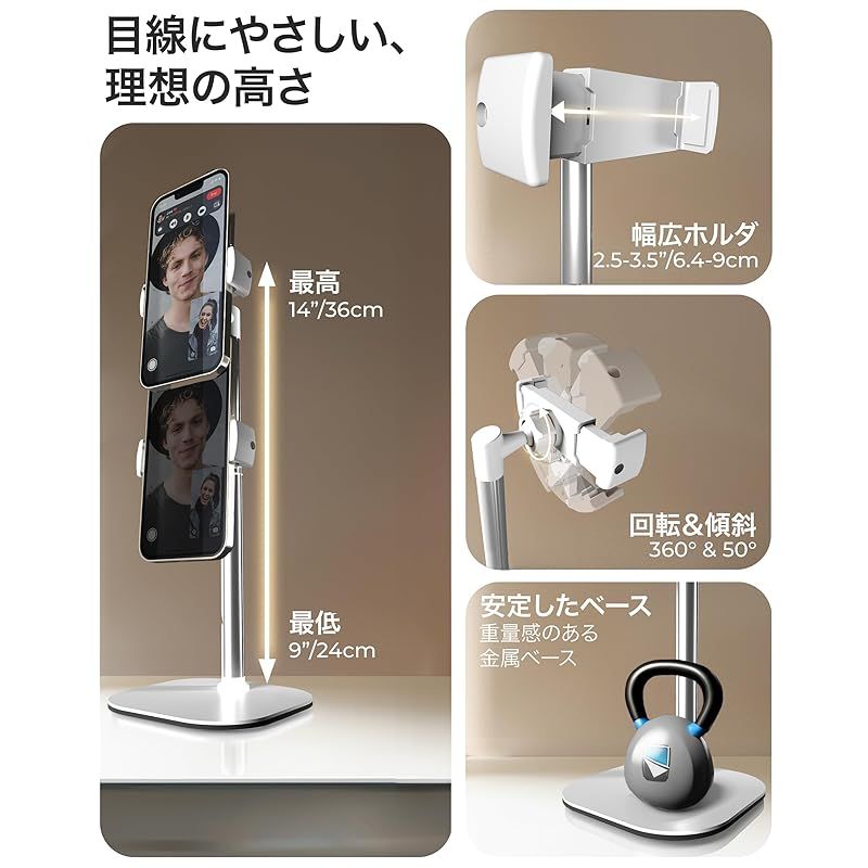 【商品説明】 目線の高さに合わせることができる、4段階高さ調整機能付きのスマホスタンドです。この携帯スタンドは、ご家族との通話、オンラインレッスン授業、リモート会議、在宅仕事など様々な用途で活躍することができます。お友達との電話やビデオコール、お仕事でのビデオ会議やオンライン会議、オンラインミーティングなどでも活躍するスマートフォンスタンドです。画面が揺れず、安定した視聴や操作をお楽しみいただけます。4.7-7インチまでの様々なスマートフォンやiPhoneに対応し、高さ調整高さ調整や角度調整機能により、スマートホンを設置した後にも、細かなアングル調整が可能、横向きでの使用も可能です。高品質のアルミニウム素材を使用した支柱による高級感や、タッチ時にも振動しない高い安定性をお楽しみください。