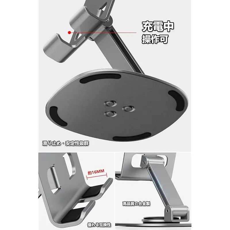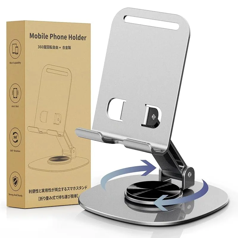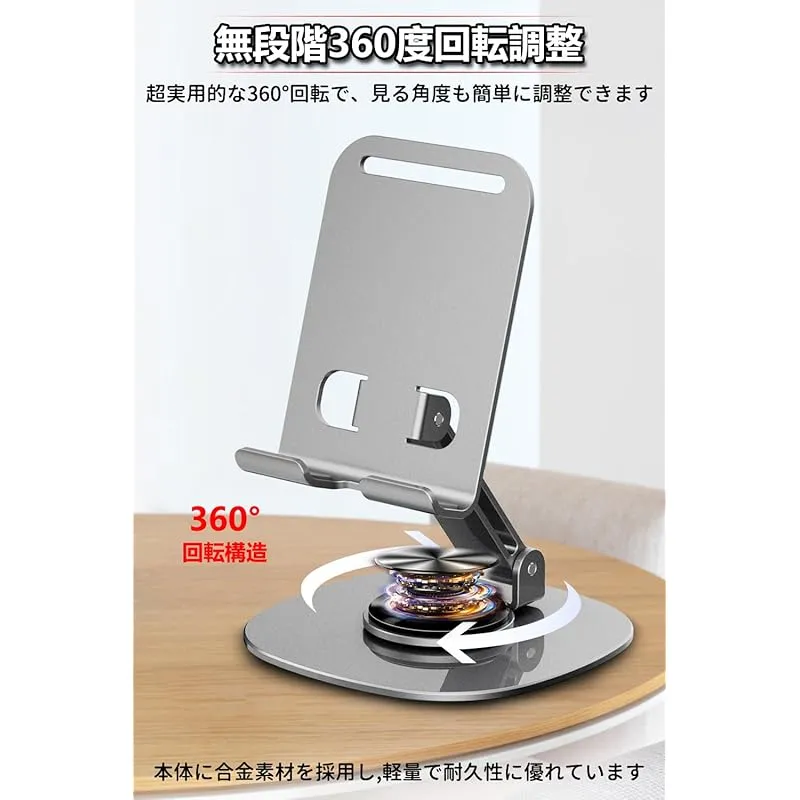 【全金属素材】スマホスタンド 卓上「極上の新設計」合金製 360度回転 折りたたみ式 携帯スタンド 薄型 携帯に便利 縦 横 滑り止め 4.7-6.8インチのiPhone Android 対応