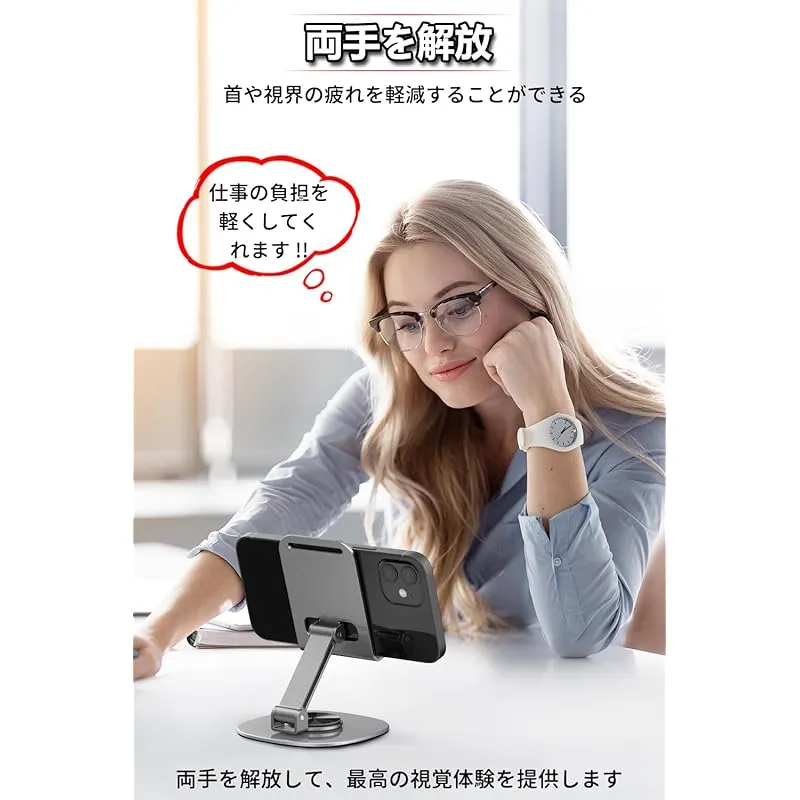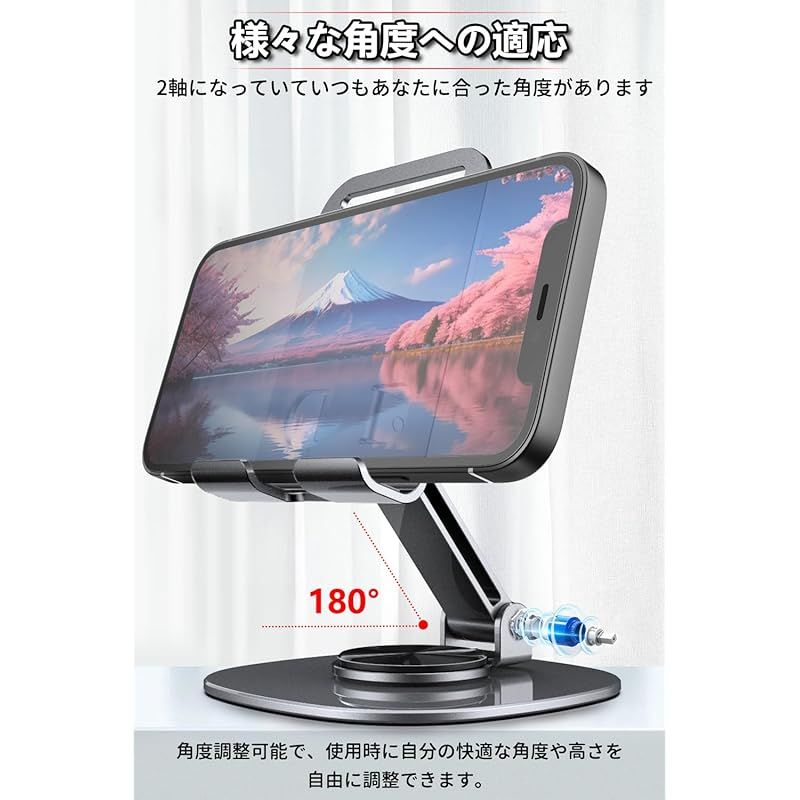 【360度回転可能】スマホスタンド台座が360度回転するため、スマートフォンやアイフォンを載せたまま、見せたい向きに自由に回転させることができます。カチカチと軽めのいい音が出ながら回転してかなり高級感があります。縦向きでも横向きでも、 ブラウジング、読書、ゲームに最適な角度を見つけて、負担のない体験をお楽しみください。