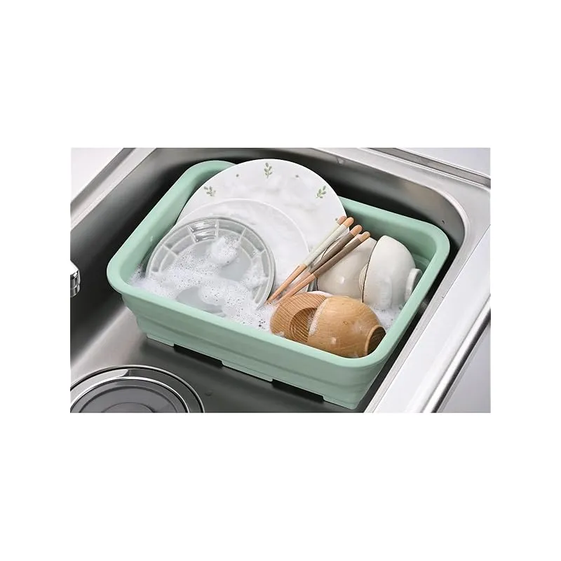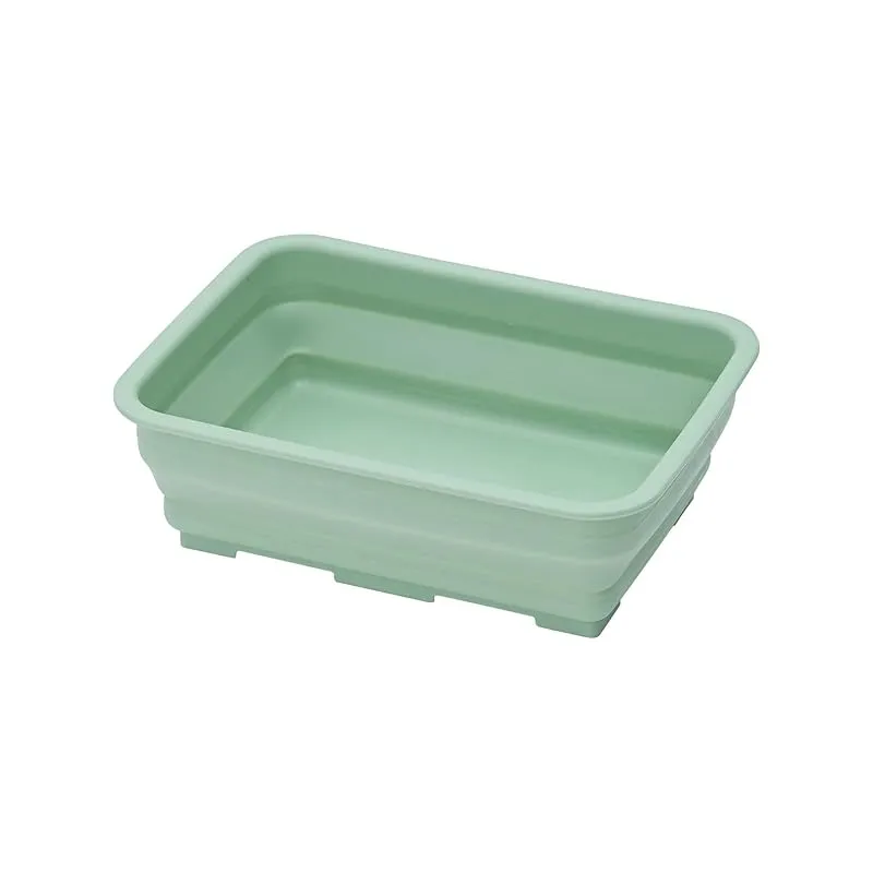 【商品概要】 本体サイズ:使用時/約縦27.3cm×37cm×11.9cm、折りたたみ時/約縦27.3cm×37cm×5.5cm 本体重量:480g 素材:本体フチ・底部/ポリプロピレン、本体蛇腹部/熱可塑性エラストマー 色:グリーン 生産国:中国
