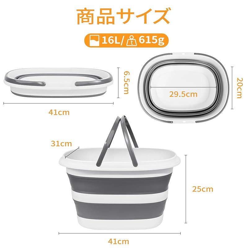 【製品基本仕様】:折りたたみ バケツの材質は高品質PP+TPRを使用しており、お手入れが簡単、容量は16L、展開サイズは縦41cm*横31cm*高さ25 cm、折りたたみサイズは縦41cm*横20cm*高さ6.5 cmです。重量は約615g。