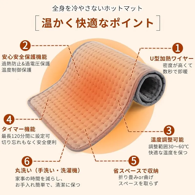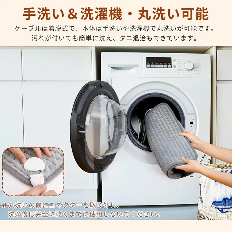 【洗える&省スペースで収納可能】この電気ホットマットは薄くて軽くて、柔軟性に優れます。,折りたたみ可能で、曲げたりしても損傷しません。また、スペースを取らず、収納と携帯に便利ですので、おうちはともかく、オフィスや旅行でも活躍します。手洗い、洗濯機で丸洗いもOKです。(丸洗いの前に、コネクターを取り外す必要があります。)