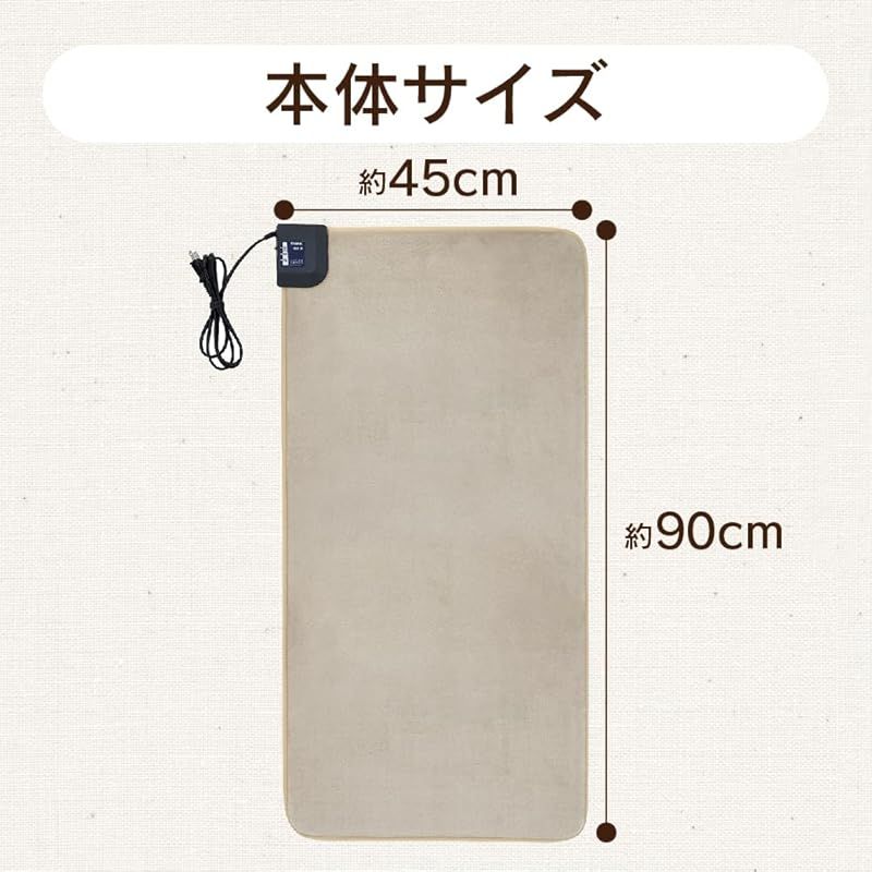 【商品概要】 定格:AC100V 60W 寸法:約90×45 表面材質:ポリエステル100% 電源コード:ビニルキャプタイヤコード(VCTFK) 安全装置:温度ヒューズ 温度制御方式:電子式制御 表面温度:強(約45℃)/弱(約38℃)