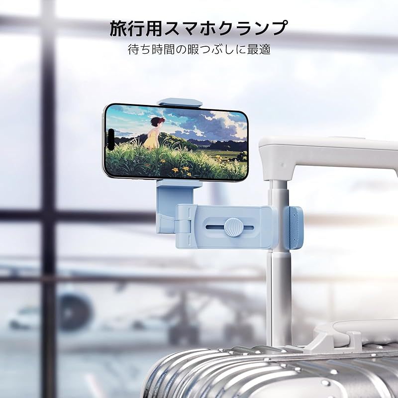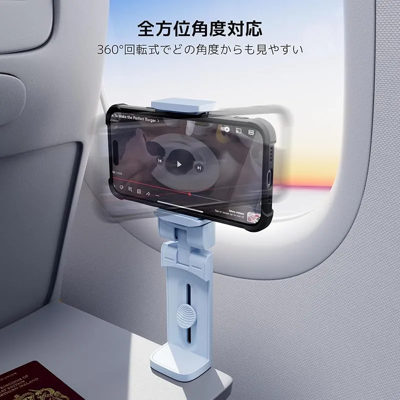 【各場所で大活躍スマホホルダー】卓上、デスク天板の端、飛行機客室の折りたたみ式トレイ、スーツケースのキャリーバー、どこでも設置可能です。オフィス、ベッドサイド、キッチン、ジム、ホテル、車内などの場所で、両手を解放して自撮り、動画視聴、ビデオ通話などを楽しみます。