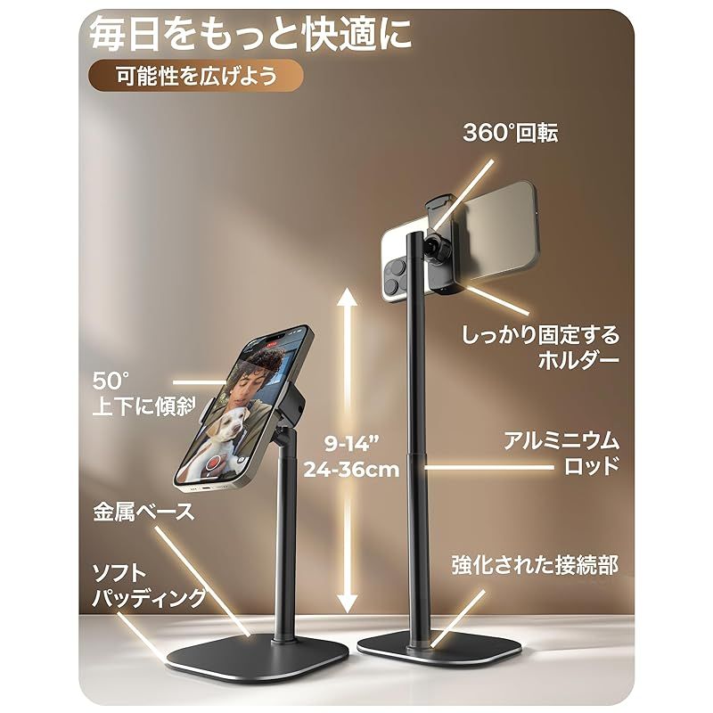 【商品説明】 目線の高さに合わせることができる、4段階高さ調整機能付きのスマホスタンドです。この携帯スタンドは、ご家族との通話、オンラインレッスン授業、リモート会議、在宅仕事など様々な用途で活躍することができます。お友達との電話やビデオコール、お仕事でのビデオ会議やオンライン会議、オンラインミーティングなどでも活躍するスマートフォンスタンドです。画面が揺れず、安定した視聴や操作をお楽しみいただけます。4.7-7インチまでの様々なスマートフォンやiPhoneに対応し、高さ調整高さ調整や角度調整機能により、スマートホンを設置した後にも、細かなアングル調整が可能、横向きでの使用も可能です。高品質のアルミニウム素材を使用した支柱による高級感や、タッチ時にも振動しない高い安定性をお楽しみください。