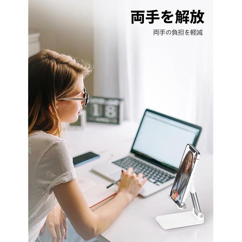 【両手を解放】オフィスデスク、食卓、料理台に適用できます。仕事中でもメールやメッセージ受信を確認できます。充電しながら動画やゲームを楽しめます。人間工学に基づいてデザインされており、ミリ単位で座高に合わせ、最適な角度・高さに調整し、目の疲れ・肩こり・頚髄症・腰痛といった体への負担を減らしましょう。
