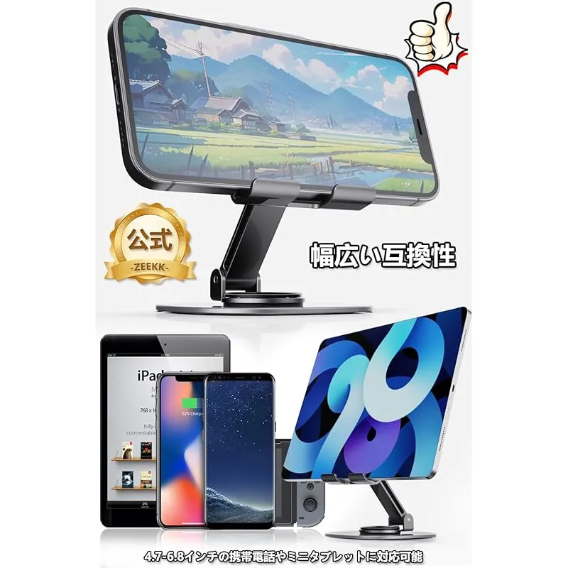 ZEEKK【全金属素材】スマホスタンド 卓上「極上の新設計」合金製 360度回転 折りたたみ式 携帯スタンド 薄型 携帯に便利 縦 横 滑り止め 4.7-6.8インチのiPhone Android 対応 0