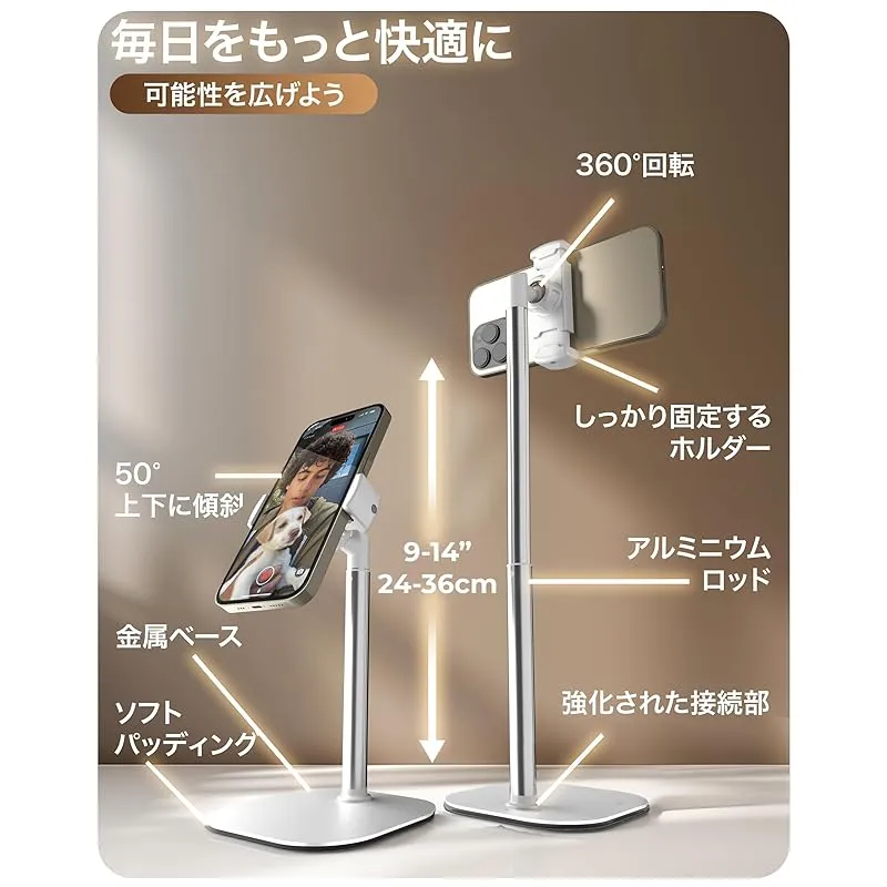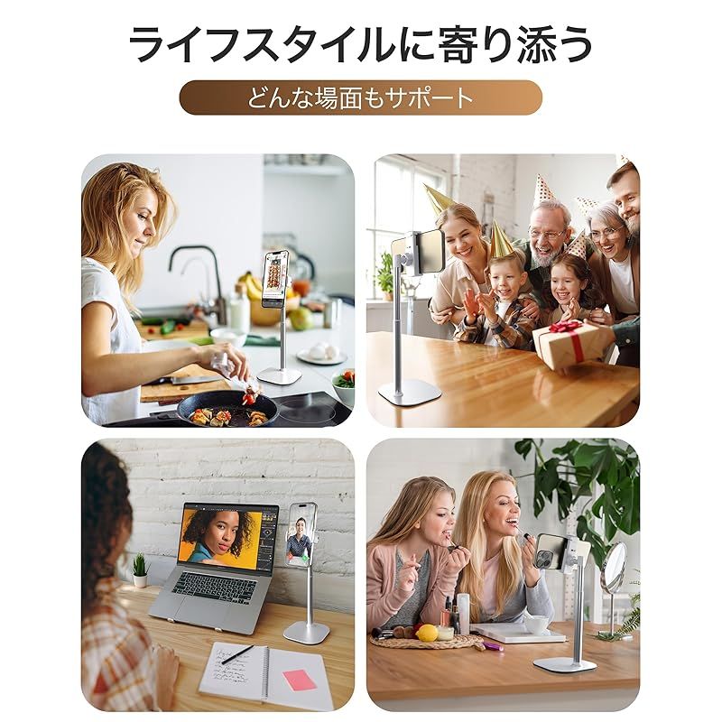 【商品説明】 目線の高さに合わせることができる、4段階高さ調整機能付きのスマホスタンドです。この携帯スタンドは、ご家族との通話、オンラインレッスン授業、リモート会議、在宅仕事など様々な用途で活躍することができます。お友達との電話やビデオコール、お仕事でのビデオ会議やオンライン会議、オンラインミーティングなどでも活躍するスマートフォンスタンドです。画面が揺れず、安定した視聴や操作をお楽しみいただけます。4.7-7インチまでの様々なスマートフォンやiPhoneに対応し、高さ調整高さ調整や角度調整機能により、スマートホンを設置した後にも、細かなアングル調整が可能、横向きでの使用も可能です。高品質のアルミニウム素材を使用した支柱による高級感や、タッチ時にも振動しない高い安定性をお楽しみください。
