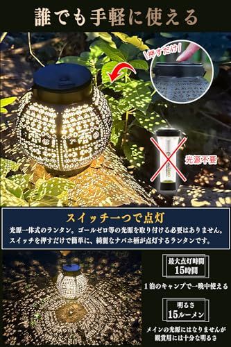 【大容量のバッテリー内臓】15時間点灯するので、一晩のキャンプ泊で付けっぱなしでも切れることがありません。