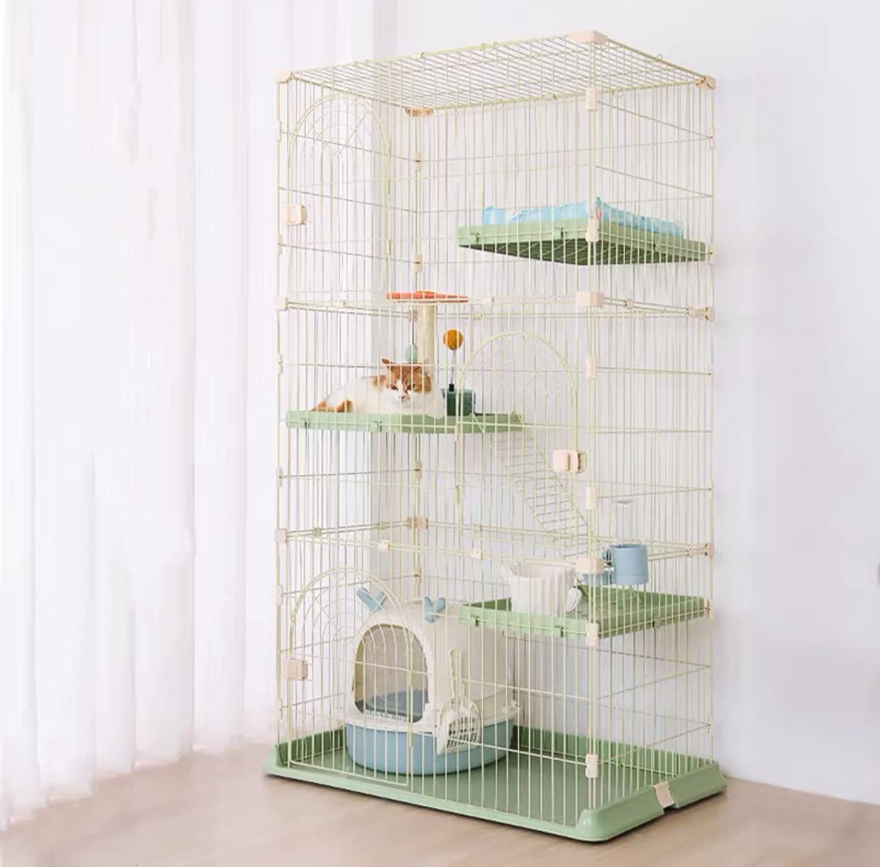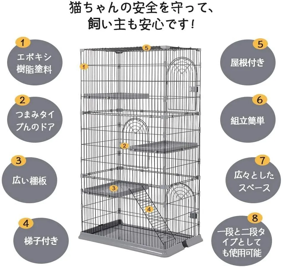 D★キャットケージ 3段 幅76×奥行50.5×高さ133cm 猫用ケージ トレー付き 棚板・はしご付き 室内用 大型扉 組立簡単 グリーン