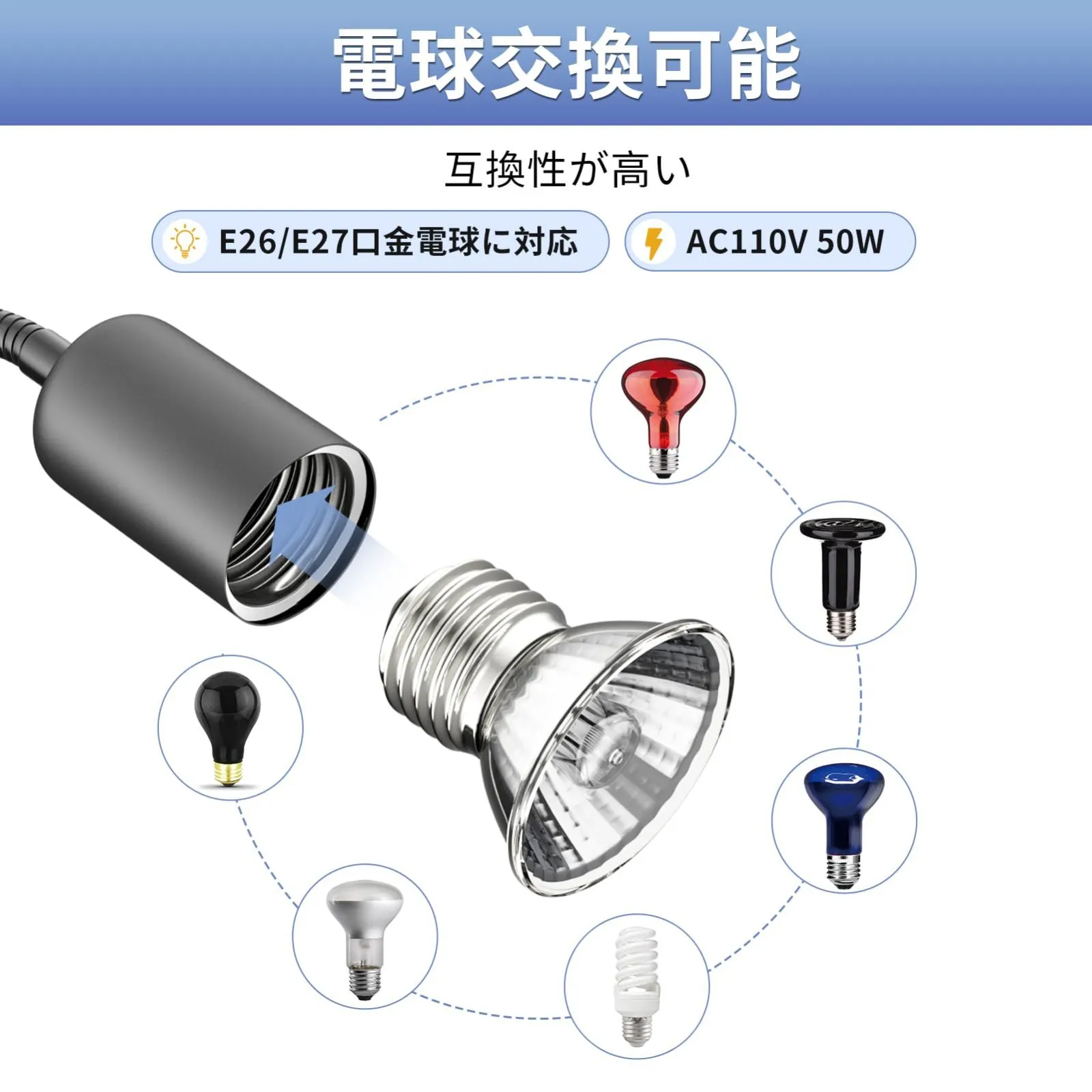 【役割が多く】本製品はカメ、ヘビ、カエル、ヒキガエル、カマキリ、カタツムリ、コウモリ等の爬虫類には最適、1本のライトで紫外線、バスキングの機能が持つ。それに植物の成長と魚類の観賞でも適応です。 本製品は調光機能を備えているため、調光可能な水銀灯、蛍光灯、または一部のLEDライトのみ交換可能です。他のタイプのライトを使用すると、点灯しないまたは点滅する場合があるため、ご注意ください。交換する前に、ライトが調光機能に対応しているかどうかを確認してください。