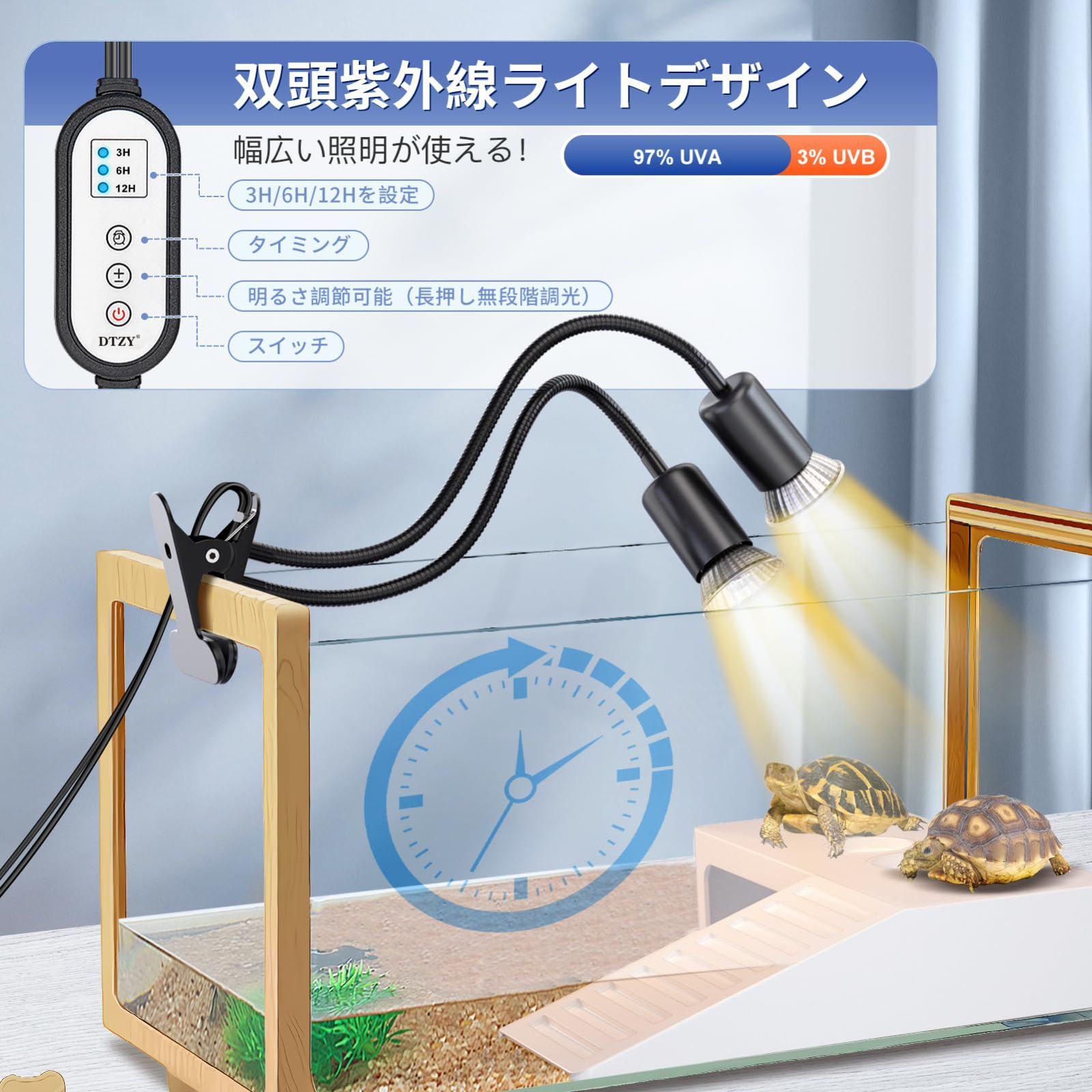 【注意事項あり】DTZY二頭爬虫類 ライト 亀 バスキング ライト兼用 50W 25W 保温電球 アナログ太陽 UVA&UVBランプ 24時間サイクルタイマー機能 明るさ調節可能 360度回転可能 爬虫類&両生類適用
