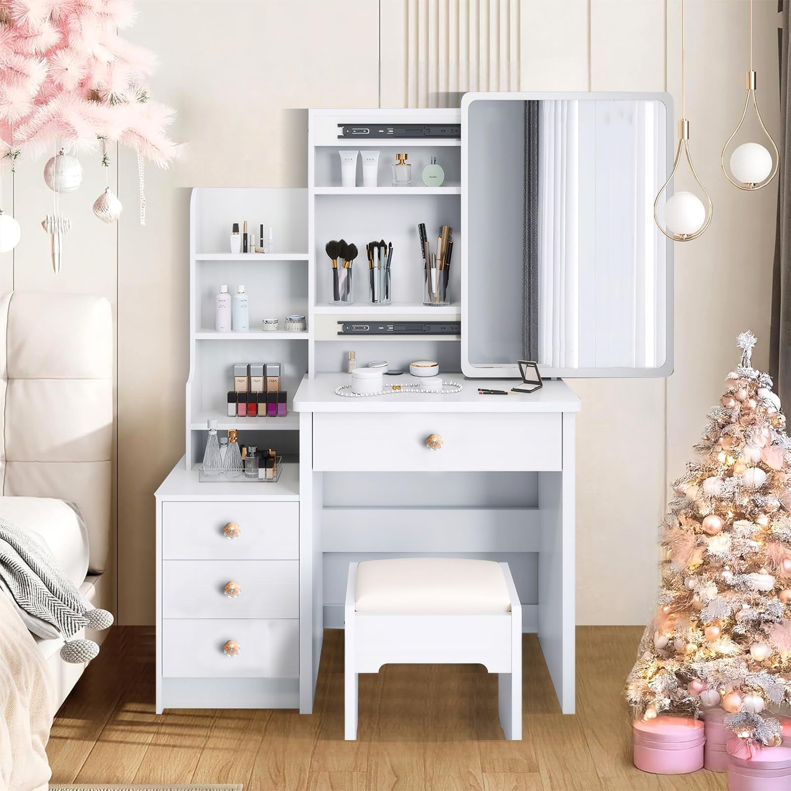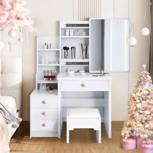 【超大容量】独立した大容量の引き出しと開放棚、計4箇所の収納スペースで、誰でも収納達人になれます。この収納付きドレッサーは、化粧品、マニキュア、香水、アイライナーなど、あらゆるアイテムを種類別にきちんと整理収納