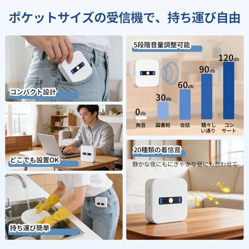【音と光で即通知 ? 高齢者にもわかりやすい】 介護 ブザーは最大110dBの大音量フラッシュライト付きで、視力・聴力に不安がある方も安心。20種の呼び出しチャイムから選べ、音量調整も可能。家庭用ナースコールとして快適に使用可能。