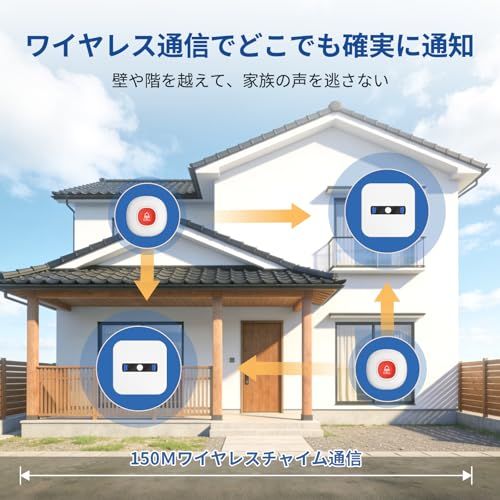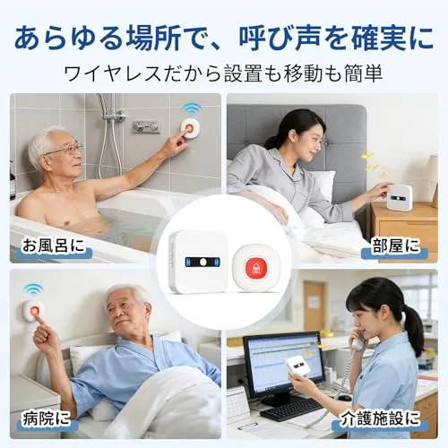 【長距離ワイヤレス通信 ? 家全体をカバー】 本製品は無線 ワイヤレスコールボタンとして、最長100150mの範囲で安定した通信を実現(見通し環境)。ナースコール スマホ連動不要、完全オフラインで使用可能。電池式コードレスでどこでも設置OK。