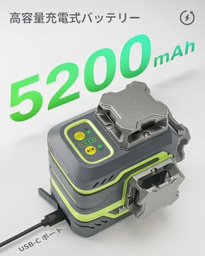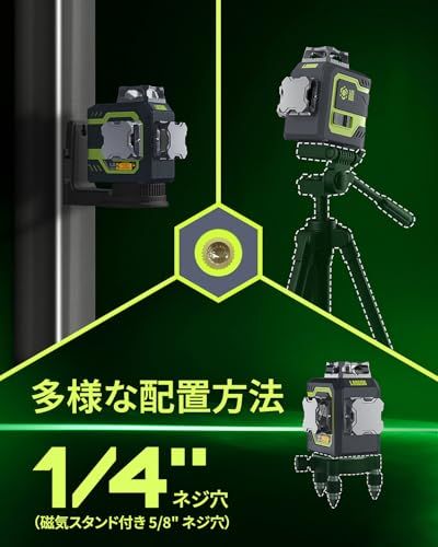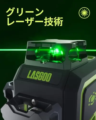D★LasGoo LG-3DM グリーンビームレーザー水準器、セルフレベリング3x360°クロスラインレーザー、建築・絵画吊り下げ用、5200mAh内蔵充電式バッテリー、Type-Cケーブル、マグネット式回転スタンド付属