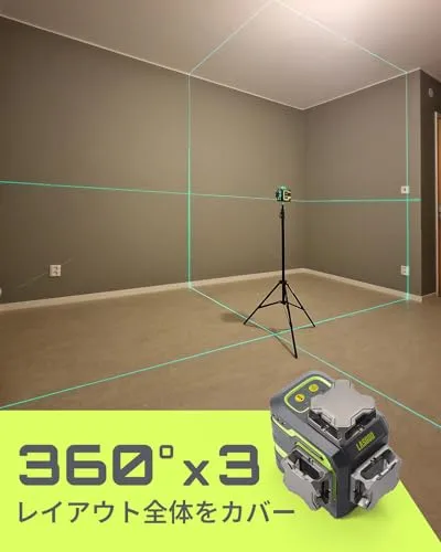 3x360 度フルレイアウトカバレッジ:LasGoo LG-3DMは、水平線1本と垂直線2本で、あらゆるレベリングやアライメントプロジェクトのために設計されています。360 度全方向に回転し、部屋全体をカバーし、どの角度からでもレーザー位置を確認することができます