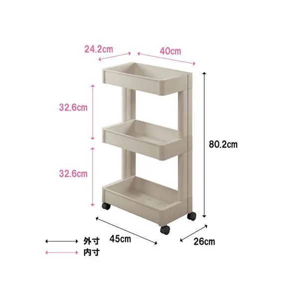 ■商品スペック サイズ(約):幅450×奥行260×高さ802mm 材質/ポリプロピレン 重量(約)2390g 耐荷重:上段:2kg中段:4kg下段:8kg合計14kg 耐熱温度:100度 必ず平坦な場所でご使用ください。移動させる際、特にカーペットの上などはコロが回転しにくくバランスを崩し転倒するおそれがあります。十分に注意してゆっくりと移動してください。 本品を脚立、踏み台として使用したり、強い衝撃を与えないでください。破損しけがをするおそれがあります。
