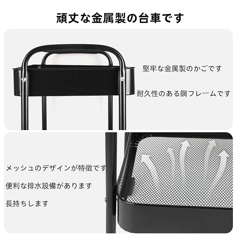 【全鋼フレーム 3段ワゴン】ステーションワゴンのボディは、堅牢で高品質なスチールフレームを採用し、耐錆性のある粉体塗装を施して耐久性を高めています。重い調味料瓶などを確実にサポートします。また、通気性の良い底板には、地面にメッシュが付いているため、湿気の多い環境でも簡単に清掃できます。また、収納カートのバスケットは全金属製で防水・防食性を確保しながらも、可愛くてスタイリッシュな見た目を醸し出しています