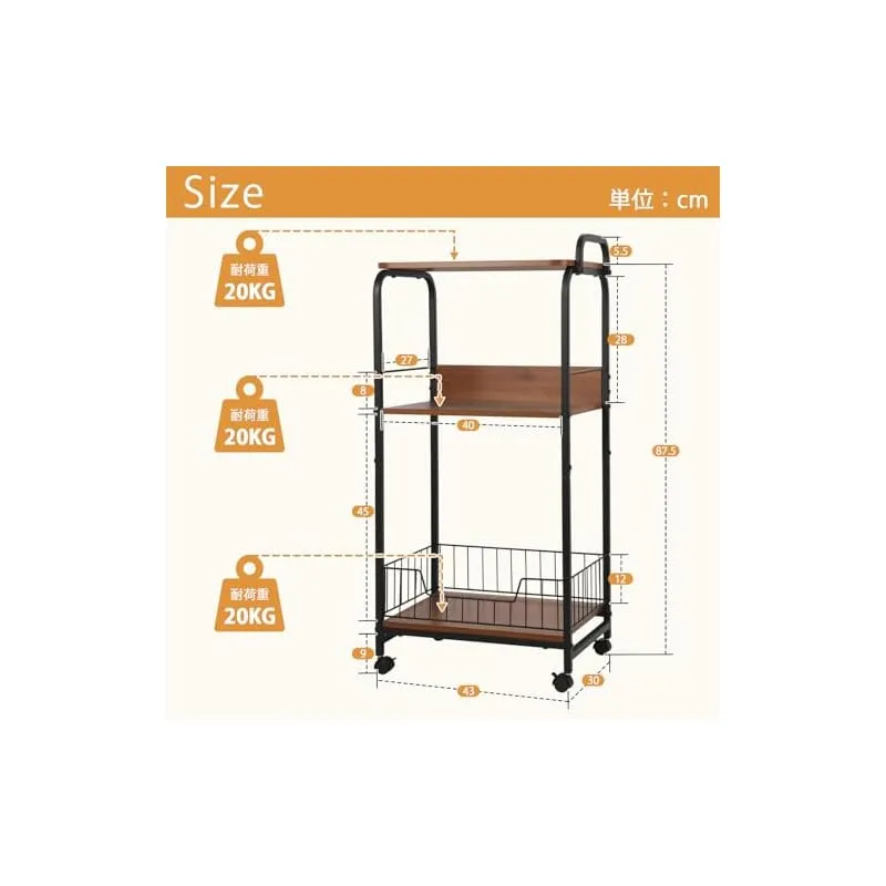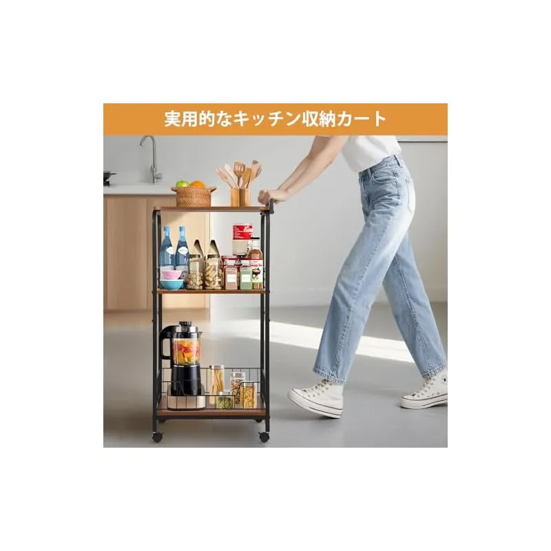 【キャスター付き3段キッチンワゴン】です。天板・棚板・メッシュバスケットの3段構造で、調理家電や調味料、日用品などをすっきり収納可能。総耐荷重約60kgで頑丈設計、長く安心して使用できます。 360°回転キャスターとハンドル付きで、収納したままスムーズに移動可能。片手操作もラクラク、掃除や模様替えも簡単です。2つのキャスターにはブレーキ機能付きで、重い荷物も安定固定でき、使用中の不意の移動を防止します。 S字フックや落下防止バーも備え、多様なキッチンツールや小物を整理整頓できます。キッチンだけでなく、リビング、寝室、バスルーム、オフィスなどさまざまなシーンで活躍。省スペースで使いやすく、シンプルデザインでインテリアにも馴染みます。