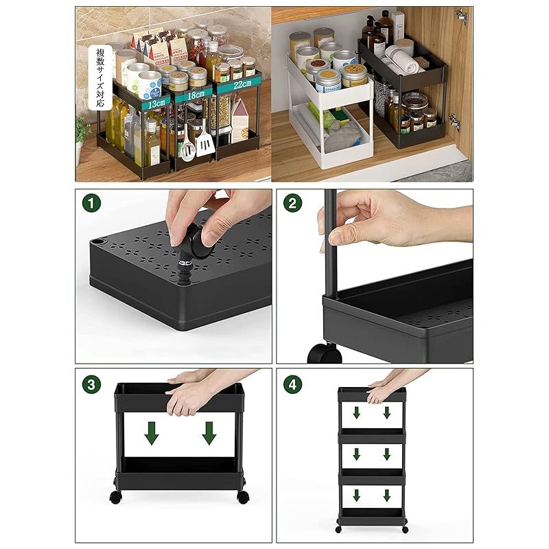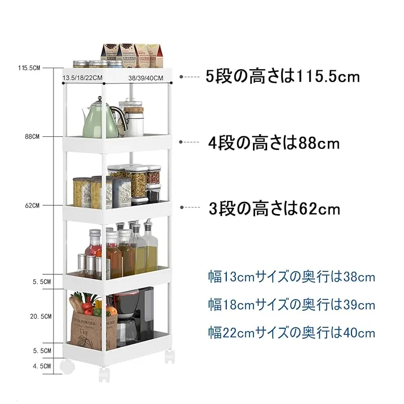 【商品説明】 キッチンによって、デッドスペースになっている隙間のサイズは様々です。 スマートワゴンは、幅13cm、18cm、22cm、22cm(スライド式)の複数のサイズをご用意しています。 ご家庭のキッチンライフに合わせてお選びください。
