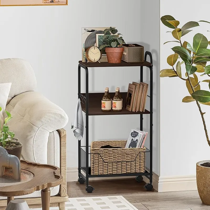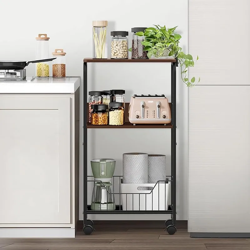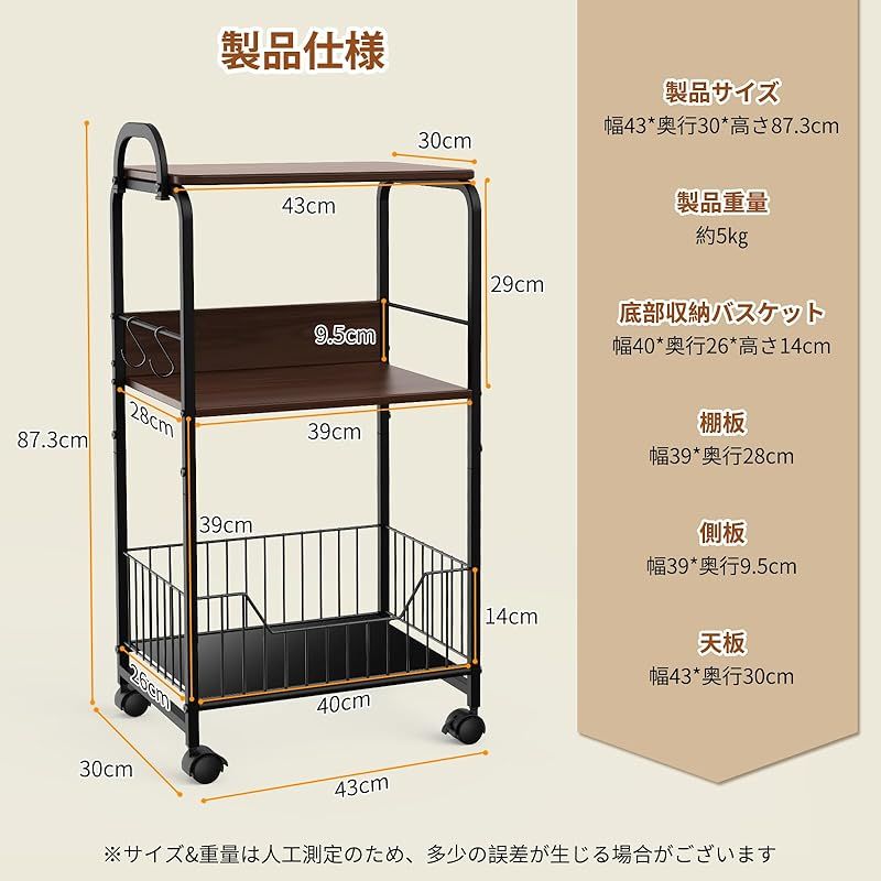 【商品仕様】 品名:3段 キッチンラック / キッチンワゴン 色:ブラック(フレーム)+ブラウン(板) 製品サイズ:幅43*奥行30*高さ87.3cm 製品本体重量:約5kg 天板サイズ:幅43*奥行30cm 天板耐荷重:約15kg 棚板サイズ:幅39*奥行28cm 棚板耐荷重:約15kg 側板サイズ:幅39*奥行9.5cm 底部収納バスケットサイズ:幅40*奥行26*高さ14cm 底部収納バスケット耐荷重:約10kg