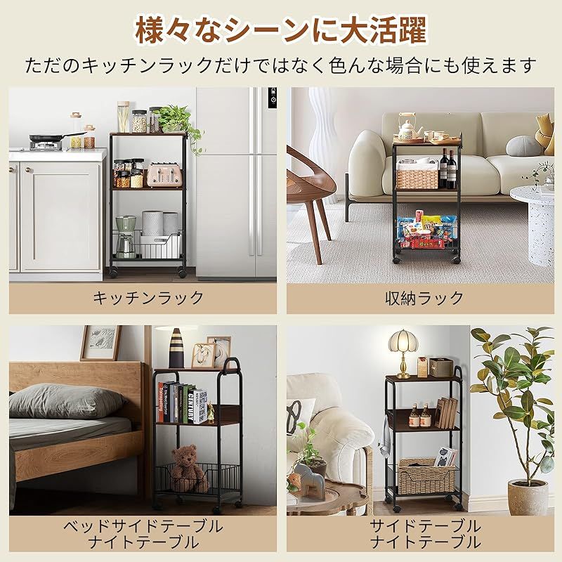 【多様な活用場所】シンプル且つ落ち着いたデザインで、インテリアに馴染みやすくて、キッチン・リビング・書斎・物置など場所を問わず大活躍しております。??ただのキッチンラックやキッチンワゴンだけではなく、サイドテーブル、ベッドサイドテーブル、 ソファーテーブルやナイトテーブルとしてもおすすめです。