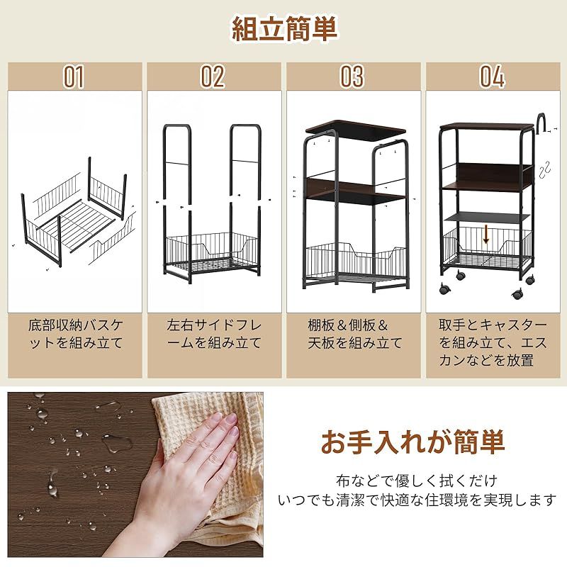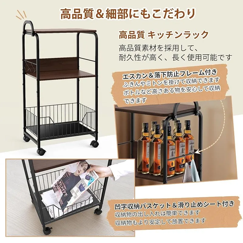 【高品質&細部にもこだわり】高品質且つ防錆メタルラックですので、耐久性が高く、長く使用することも可能です。??また、吊り下げ収納できるエスカン(2個)と落下防止フレーム付き、ふきんやミトンを掛けて収納でき、ボトルなど高さある物も安心して収納できます。??底部収納バスケットは凹字の形と設計して、収納物の出し入れも簡単できます。更に滑り止めシートも付き、収納物はより安定して放置可能のキャスター付きキッチンワゴンです。