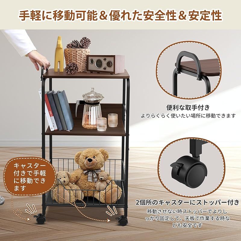 【商品詳細】 使い勝手の良い収納スペースが持ち 3段天板とキャスター付き キッチンワゴンで、使い勝手の良い収納スペースを持ち、炊飯器・小型家電・調味料などの日用品・雑貨など全てまとめて収納できており、部屋の整理整頓に活用できます。 移動がより楽 キャスターと便利な取っ手が付いており、使いたい場所にサッと移動しやすくて、普段の掃除も楽にできる天板付き キッチンワゴンです。 多様な活用場所 シンプル且つ落ち着いたデザインで、インテリアに馴染みやすくて、キッチン・リビング・キッチン・書斎・物置など場所を問わず大活躍しております。ただのキッチン収納ワゴンや収納ラックだけではなく、サイドテーブル、ベッドサイドテーブル、 ソファーテーブルやナイトテーブルとしてもピッタリです。 組立簡単 日本語の取扱説明書が付いており、説明書の手順によって、4ステップで迷いなく簡単組立可能の3段スチール ラックです。 お手入れ簡単 高品質且つ防錆スチール製キャスター付きサイドテーブルですので、長く使用することが可能である上、お手入れも簡単でき、布などで優しく拭くだけ、いつでも清潔で快適な住環境を実現します。