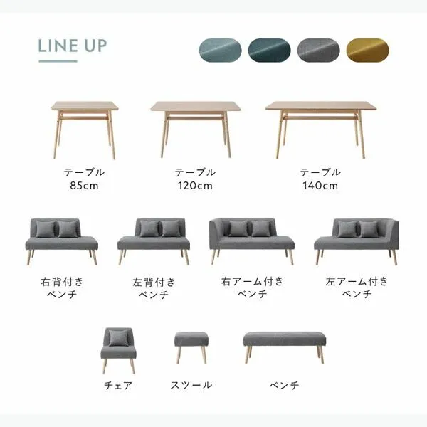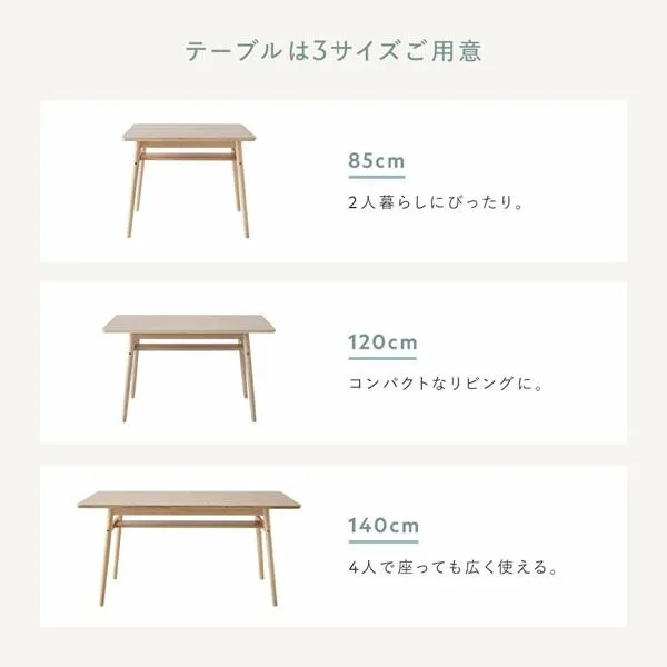 ■サイズ(約) テーブル幅85cm:幅85×奥行75×高さ66cm テーブル幅120cm:幅120×奥行75×高さ66cm テーブル幅140cm:幅140×奥行75×高さ66cm 背付きベンチ(左右共通):幅120×奥行65×高さ73cm(座面高41cm) アーム付きベンチ(左右共通):幅140×奥行65×高さ73cm(座面高41cm) ベンチ:幅120×奥行45×高さ41cm チェア:幅60×奥行65×高さ73cm(座面高41cm) スツール:幅50×奥行45×高さ41cm 脚裏径:3cm(共通) クッション:幅35×奥行35cm※背付き・アーム付きベンチは2個、チェアは1個付いています。