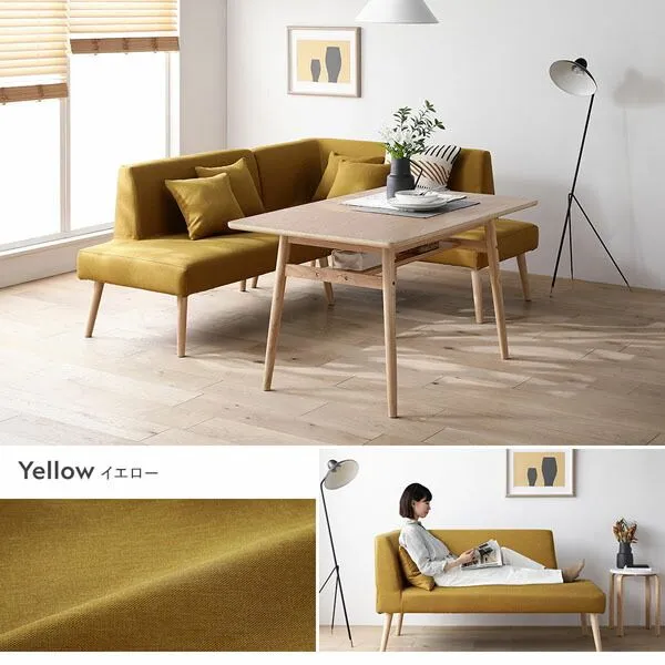 ■材質 ・テーブル 天板:オーク突板・積層合板(ウレタン塗装) 脚:ラバーウッド(ラッカー塗装) ・その他(背付きベンチ・アーム付きベンチ・ベンチ・チェア・スツール共通) 本体:パイン・ポプラプライドウッド・ウレタンフォーム・わた(ポリプロピレン・PP) 脚:ラバーウッド(ラッカー塗装) カバー:イエロー:ポリエステル100%/その他カラー:ポリエステル95%、ナイロン5%