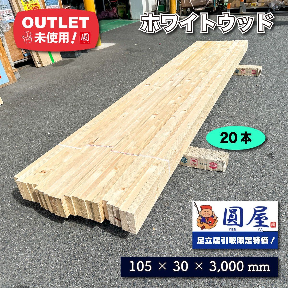 《東京足立店引取り限定特価》ホワイトウッド 角材 105×30×3000mm 20本セット【未使用アウトレット品】